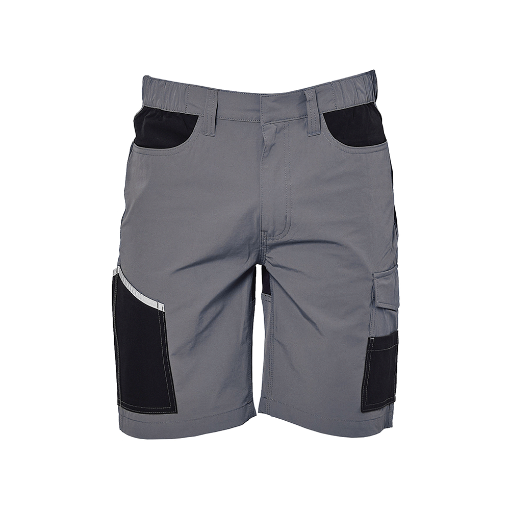 PANTALONE CORTO IN TESSUTO ELATICIZZATO IN ORIZZONTALE E VERTICALE 4 STRETCH – Tessuto in 90% nylon, 10% elastan – PESO 140 g/mยฒ – Triple cuciture – Due tasche anteriori – Una tasca laterale con velcro, una piccola tasca aperta e un passante per utensili – Una tasca anteriore portautensili con banda rifrangente – Una tasca posteriore con zip con nastratura rifrangente – Una tasca posteriore portametro o portautensili, con banda rifrangente – Elastici in vita con passanti maggiorati – Bottone automatico in vita coperto