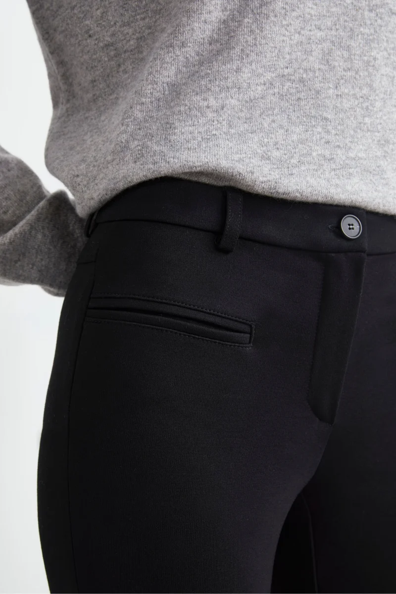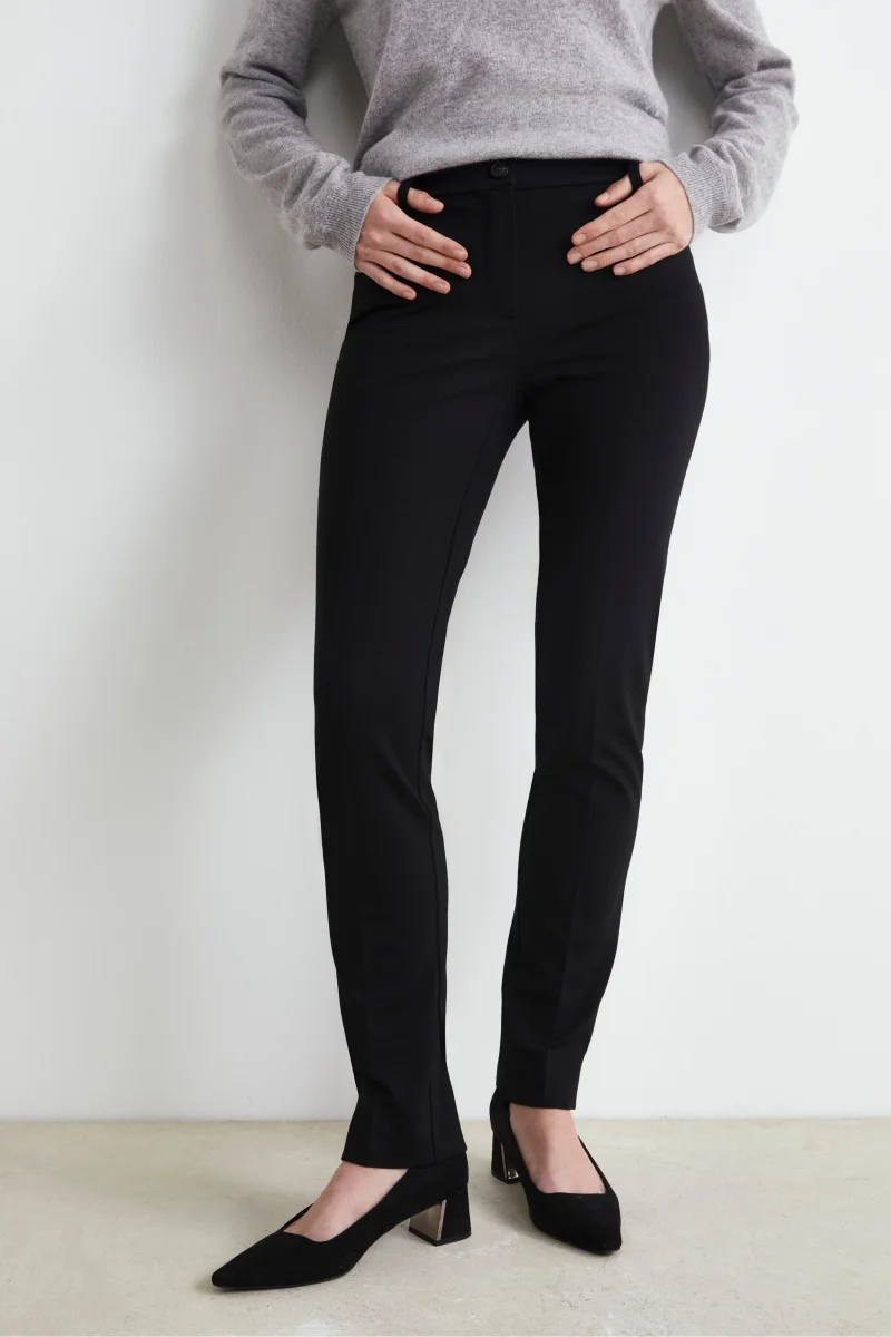 Pantalone in jersey punto milano dal taglio slim e linee asciutte. Realizzato con chiusura con zip nascosta e bottone, cintura con passanti, tasche a filetto orizzontali sul fronte e spacchetti sul fondo. Ideali da indossare di giorno con una maglia morbida o abbinato al blazer in coordinato. Made in Italy. La modella รจ alta 170 cm e indossa la taglia 40.