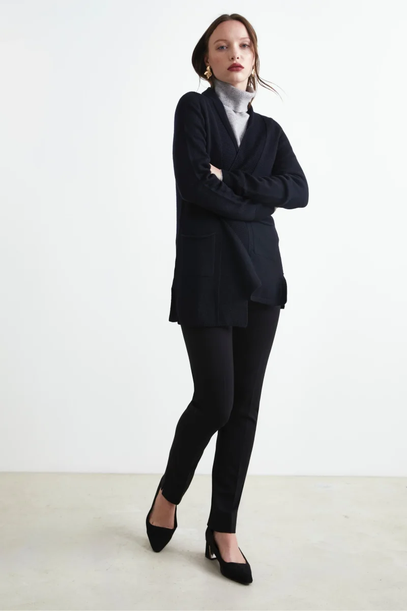 Pantalone in jersey punto milano dal taglio slim e linee asciutte. Realizzato con chiusura con zip nascosta e bottone, cintura con passanti, tasche a filetto orizzontali sul fronte e spacchetti sul fondo. Ideali da indossare di giorno con una maglia morbida o abbinato al blazer in coordinato. Made in Italy. La modella รจ alta 170 […]