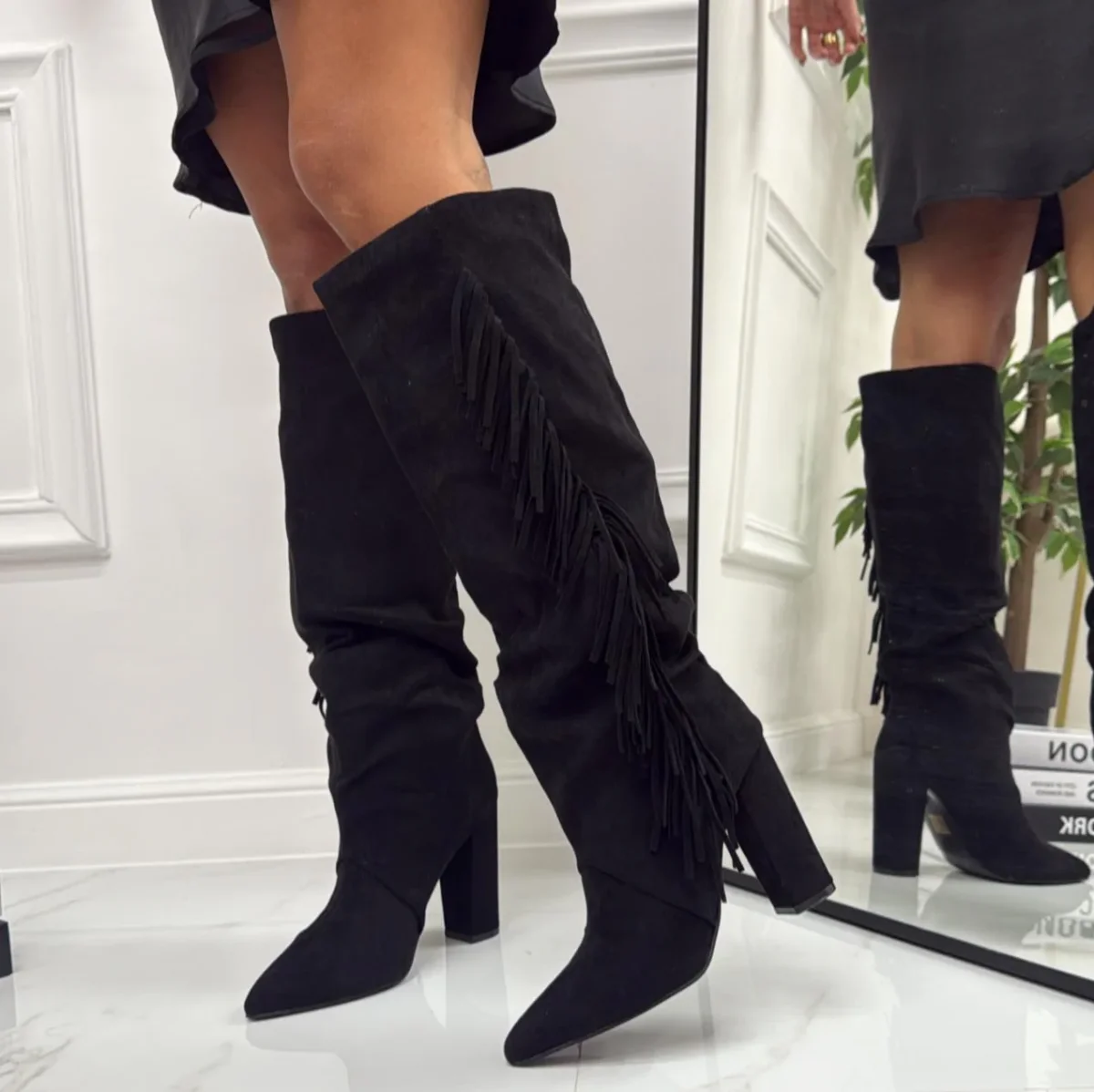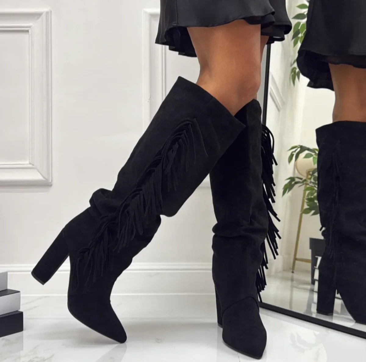 Questi stivali sono un accessorio davvero unico nel loro genere. Indossati, accompagnano perfettamente il capo della donna che decide di utilizzare, in quanto rendono la donna sicura di sรฉ in qualsiasi contesto essa si trova. La loro particolaritร รจ il tessuto in camoscio e la punta tacco alto 11 cm circa, altezza gambale 36 cm, le frange e hanno una calzata regolare. Possono essere utilizzati in contesti in cui ci si vuole vestire casual e sentirsi comodi e spensierati.