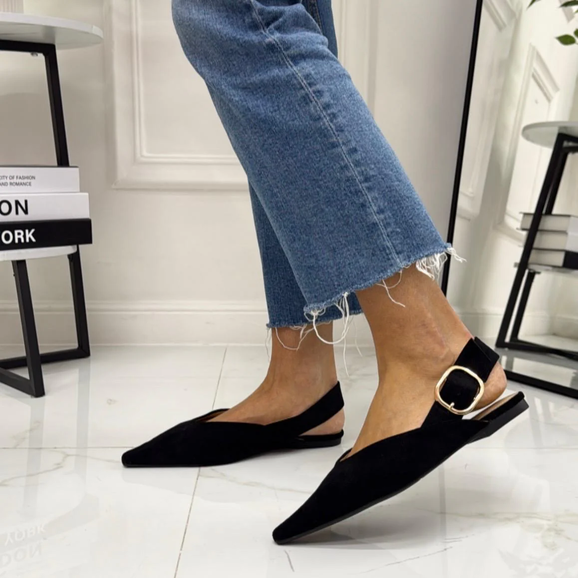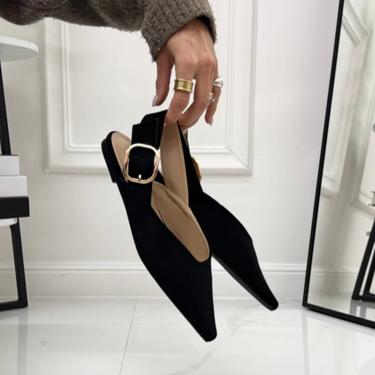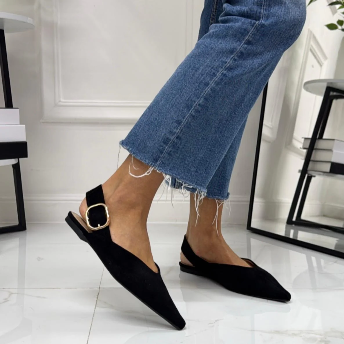 Scarpa dallo stile essenziale e raffinato, caratterizzata da una silhouette affusolata con punta elegante. Il design aperto sul tallone รจ completato da un cinturino regolabile con fibbia, che garantisce una calzata stabile e confortevole. La suola bassa la rende ideale per un utilizzo quotidiano, offrendo praticitร senza rinunciare allo stile. Un modello versatile, perfetto da abbinare sia a look casual che a outfit piรน curati, pensato per chi ama unโeleganza sobria e senza tempo.