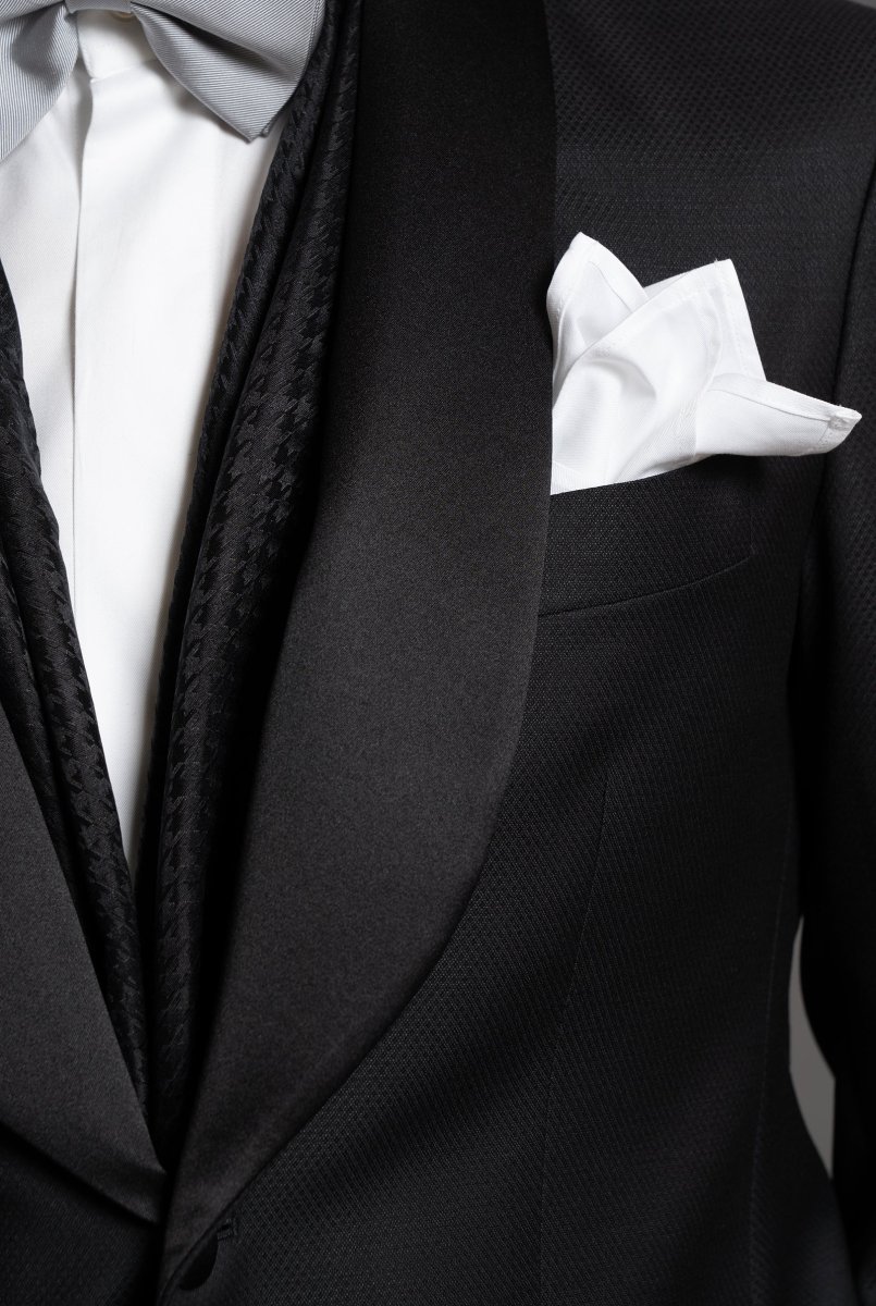 Smoking elegante con collo a scialle stile Newyorkese in raso midnight blu. Un bottone coperto in raso, bottoni maniche in raso e un raffinato spacco centrale completano il design. Tessuto in lana super fine nero micro fantasia Made in Italy. Guida alle Taglie