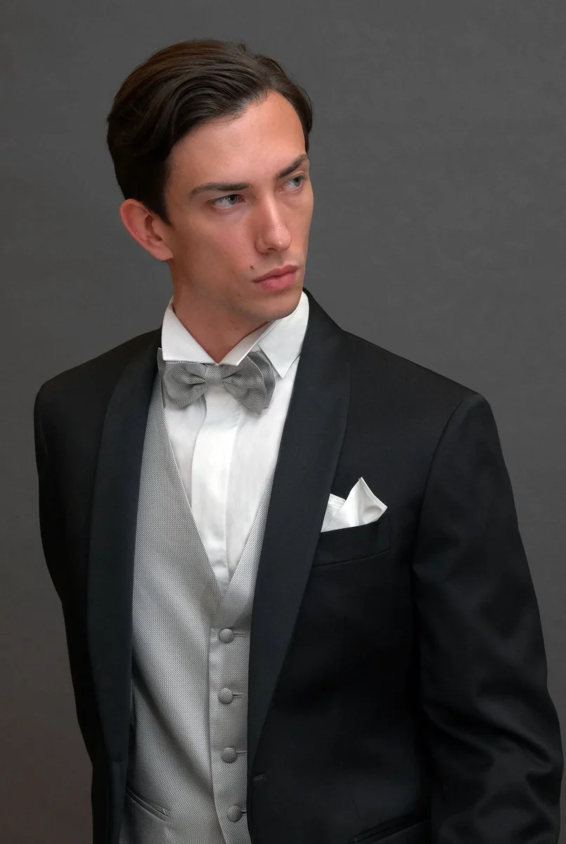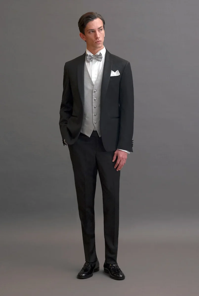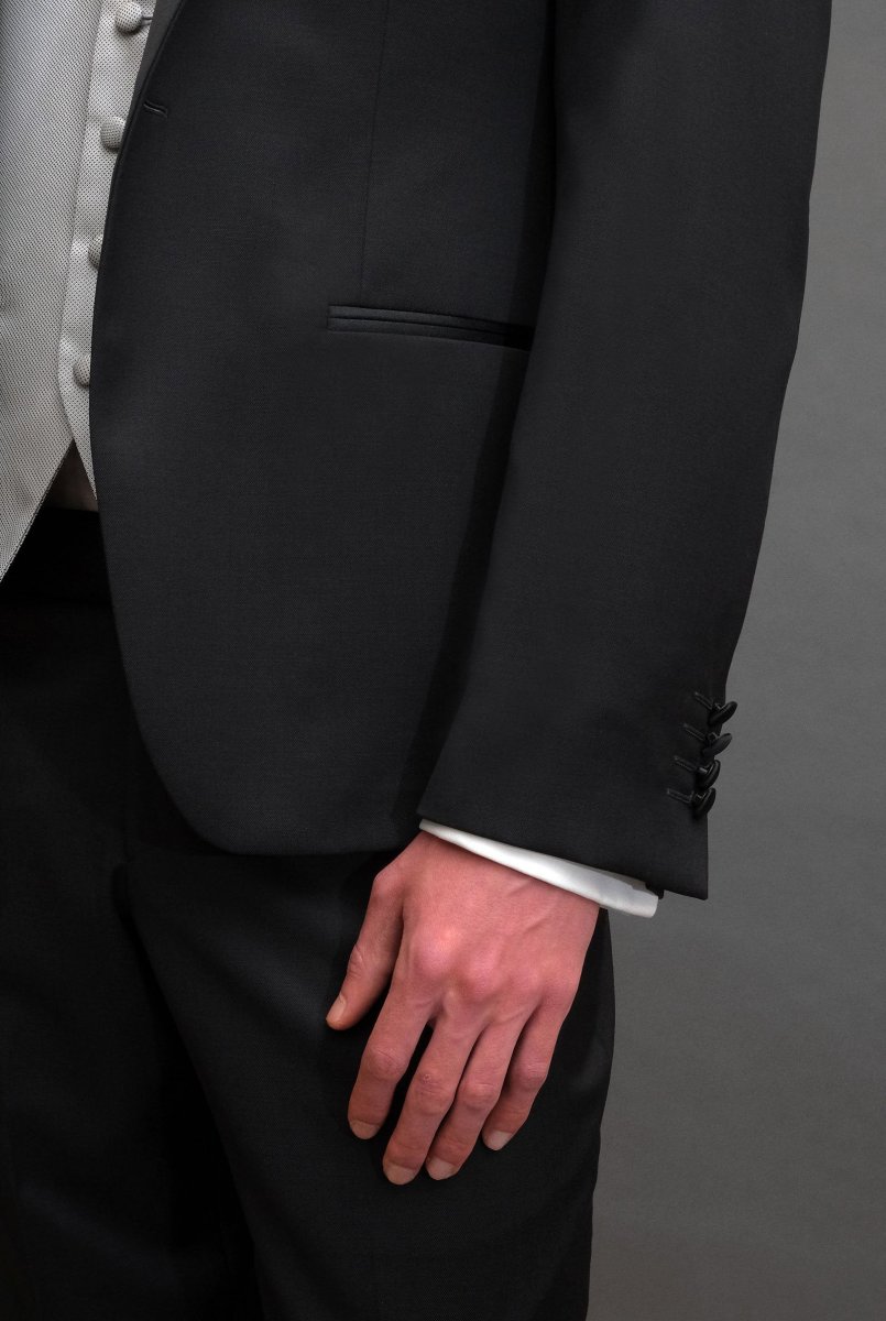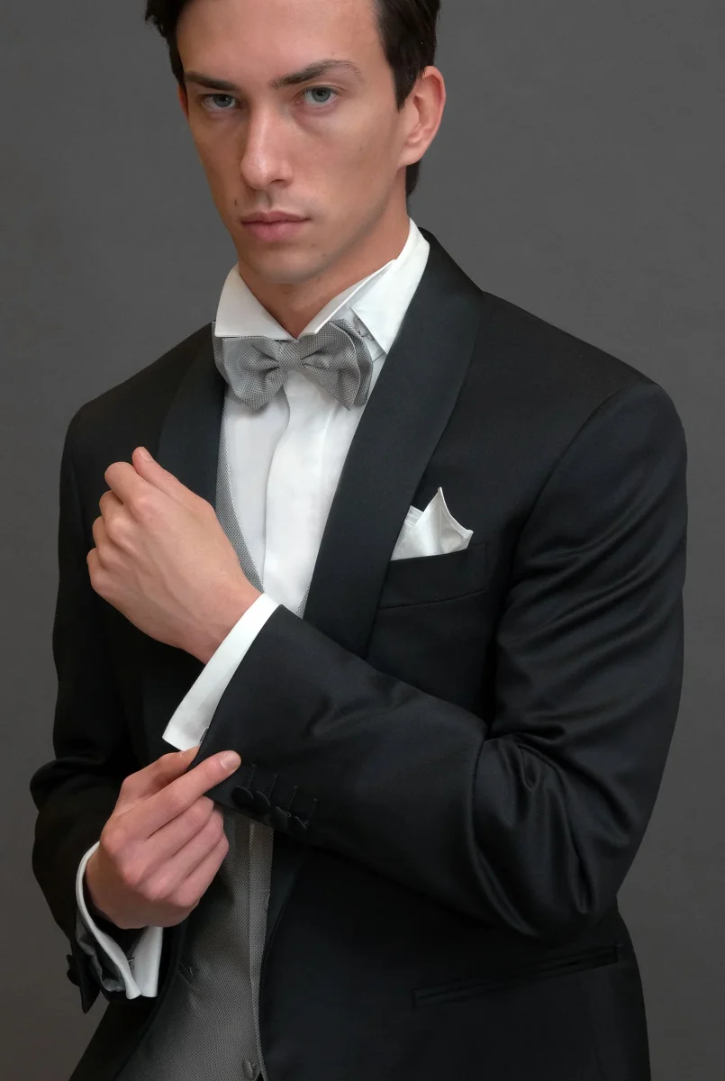 Smoking con rever a scialle punta spillo nero 130’s colore nero, collo sciallato in raso di seta nero,