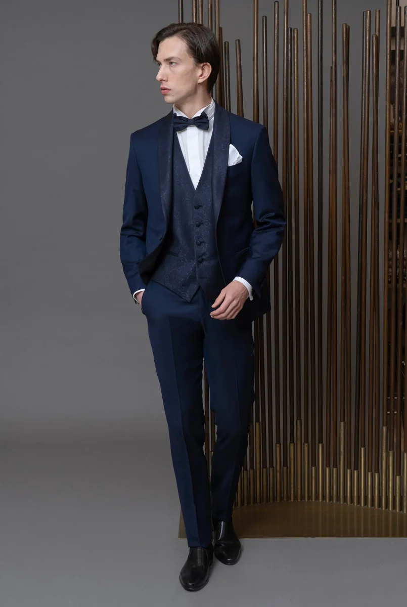 Smoking in sablè di lana finissima blu con collo sciallato damascato blu, tasche a filetto con dettaglio damascato, bottoni rivestiti con tessuto damascato.