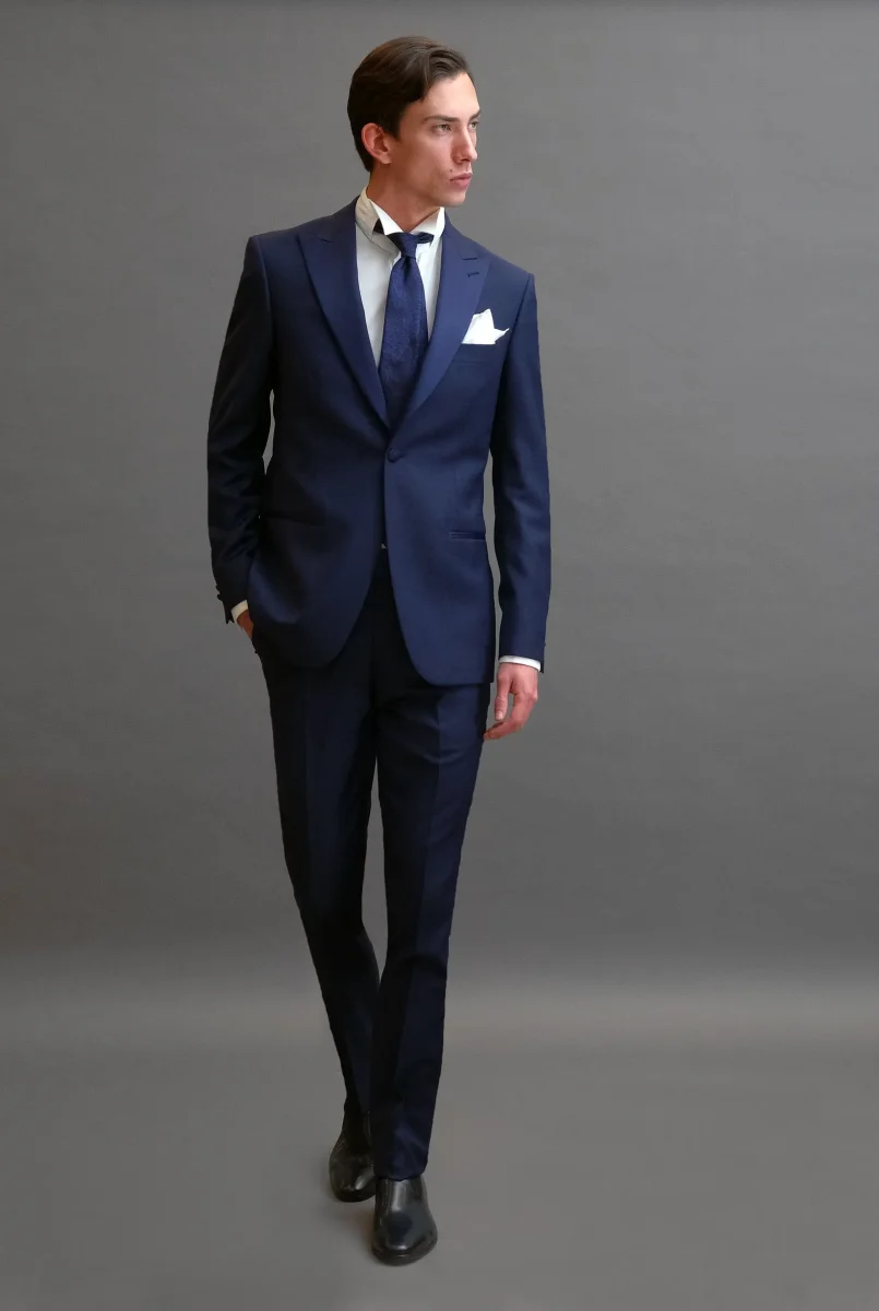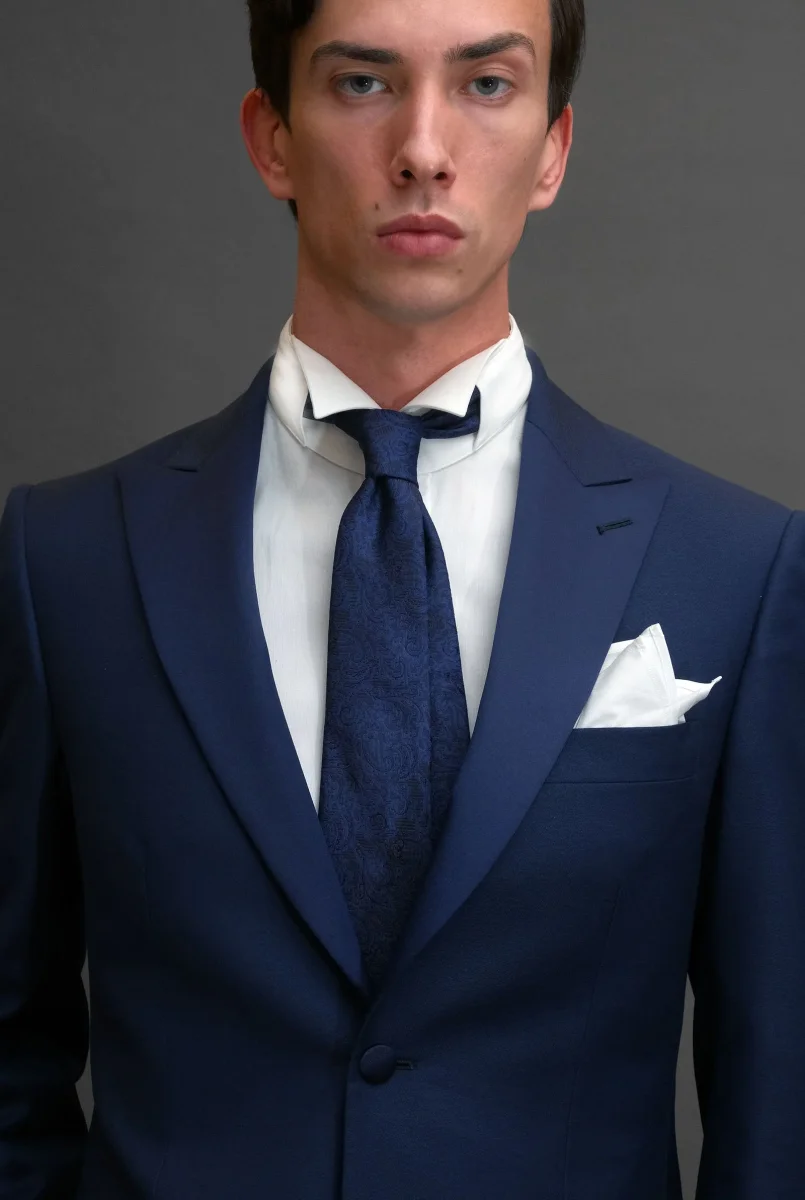 Smoking rever a lancia sablè di lana blu abbinato a Cravatta seta jacquard blu tono su tono