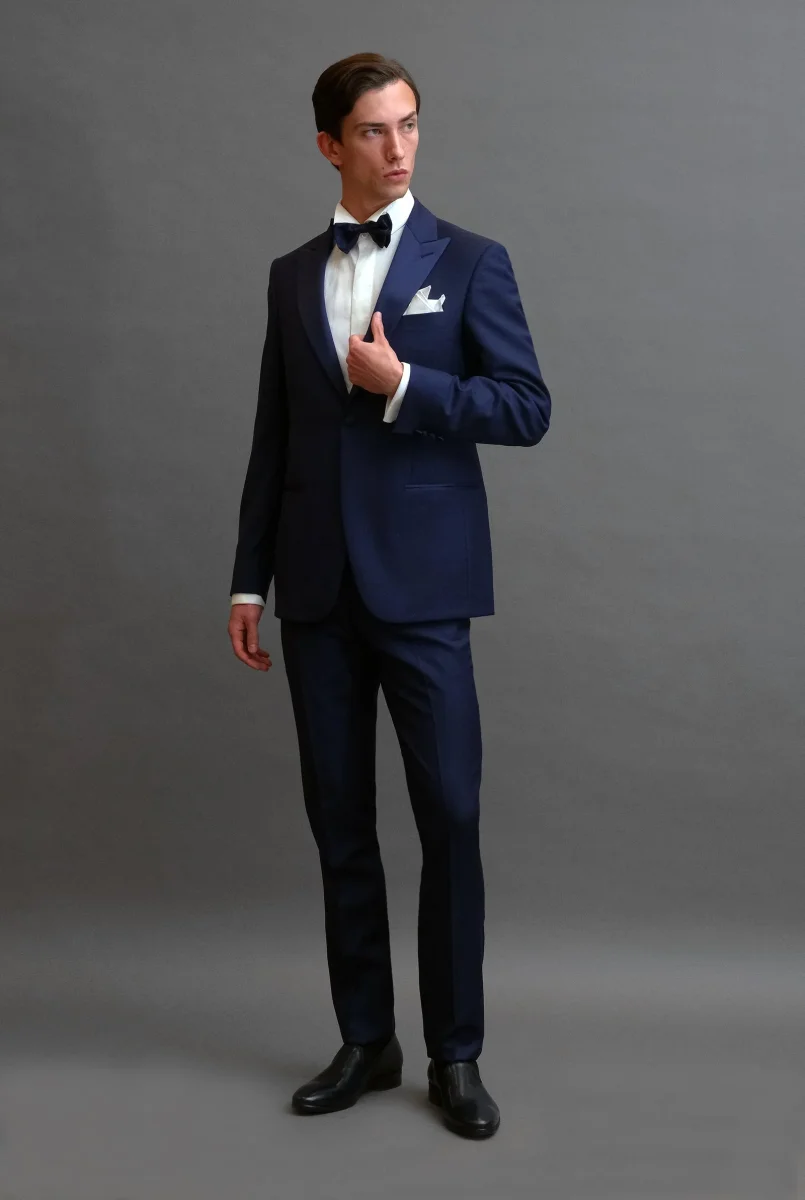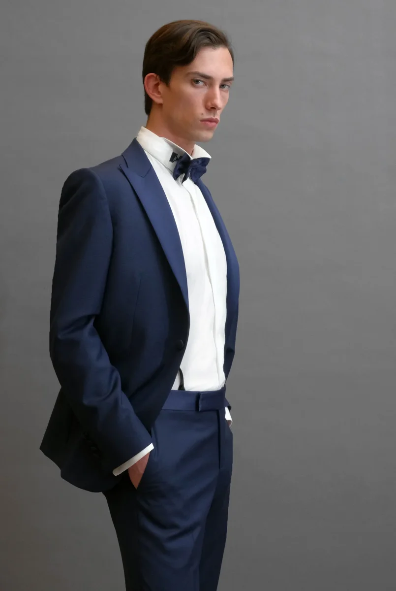 Smoking in sablè di lana 130’s colore blu avio, rever collo a lancia in raso di seta blu, tasche a filetto con dettaglio in raso di seta blu, bottoni rivestiti