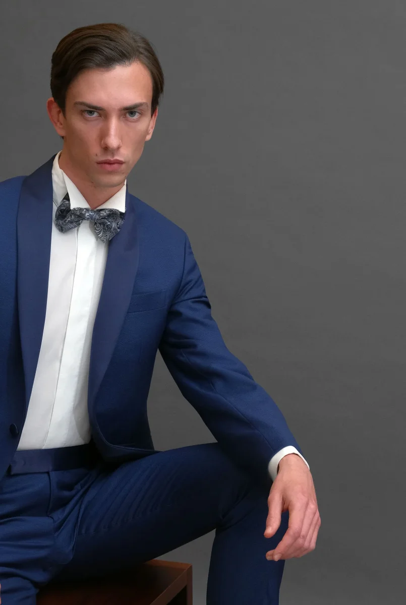 Smoking in sablè di lana 130’s colore blu avio, rever collo sciallato in raso di seta blu,
