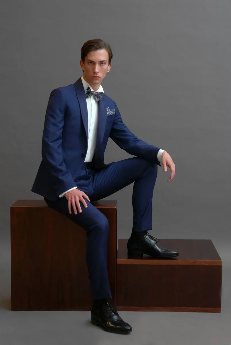 Smoking rever a scialle in sablè di lana blu