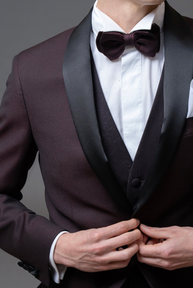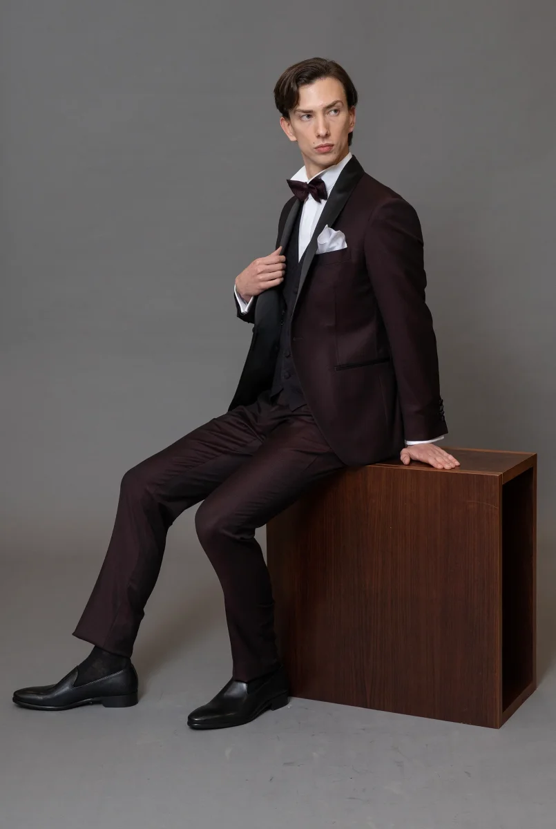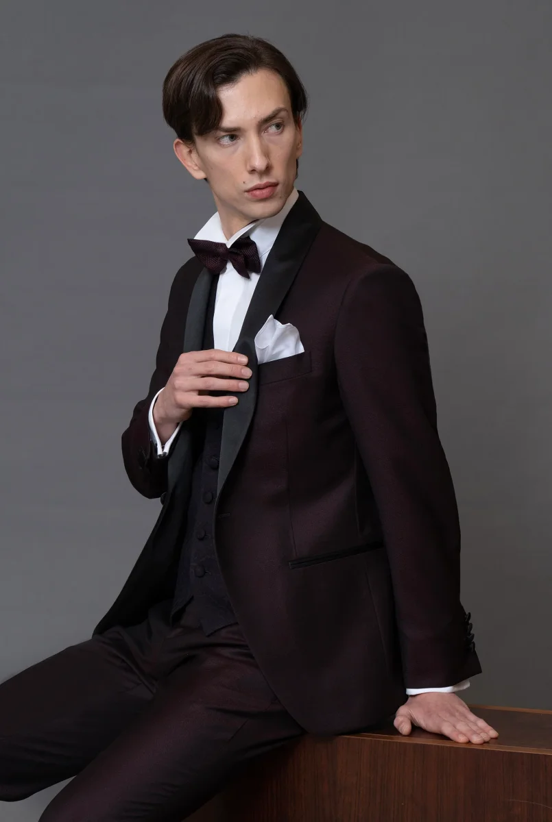Smoking rever a scialle in sablè di lana finissima Bordeaux, pantalone in lana finissima