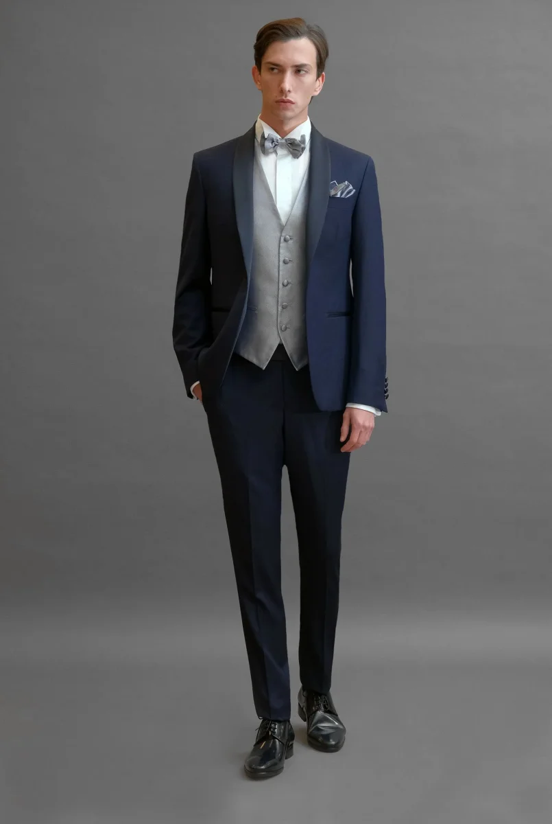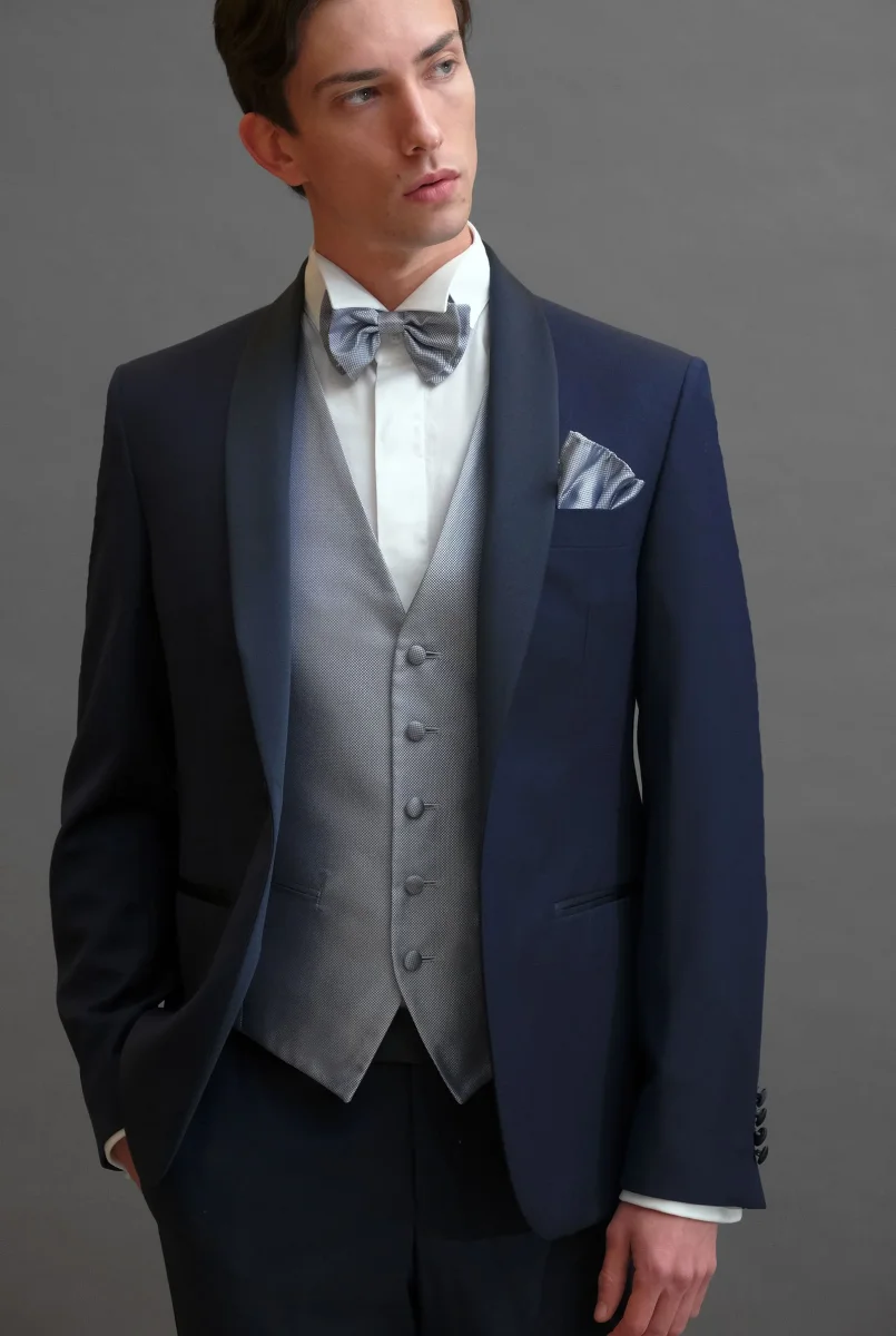 Smoking rever sciallato in sablè di lana blu abbinato a Gilet monopetto in seta jacquard