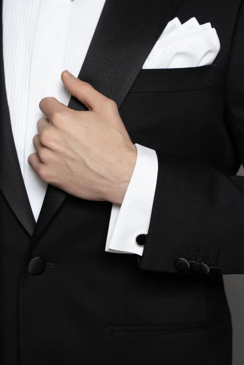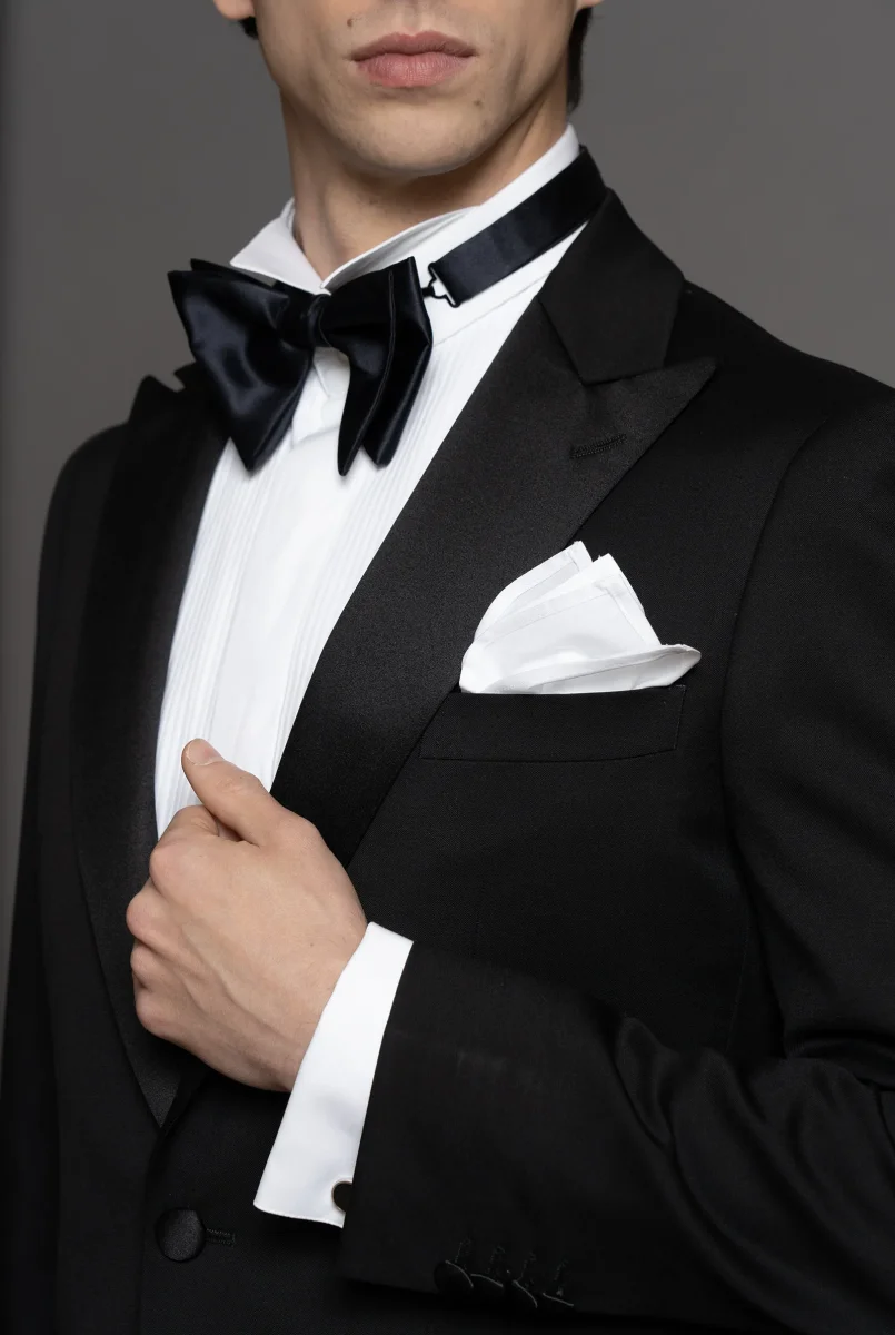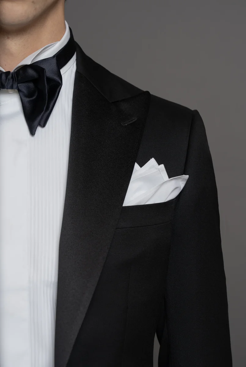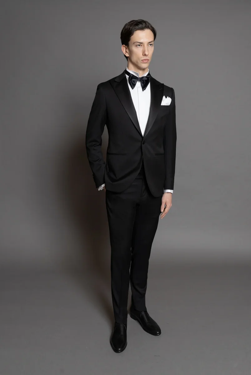 Smoking elegante in tessuto nero 130’s, con rever a lancia in raso di seta nero. Un bottone coperto in raso, tasche a filetto e bottoni manica coordinati aggiungono raffinatezza.