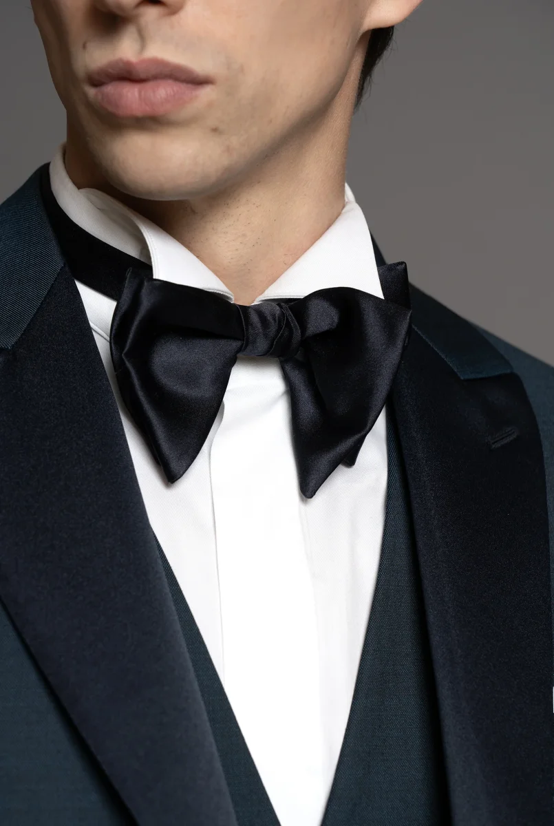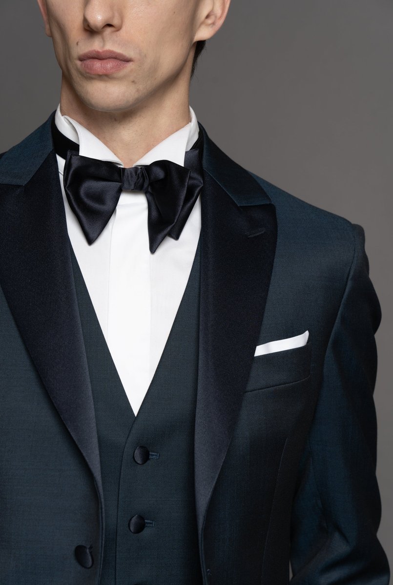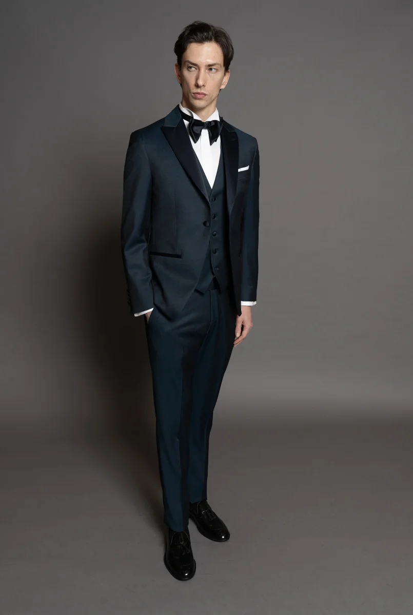 Smoking tessuto in lana super fine color blu ottanio, rever a lancia in raso blu notte
