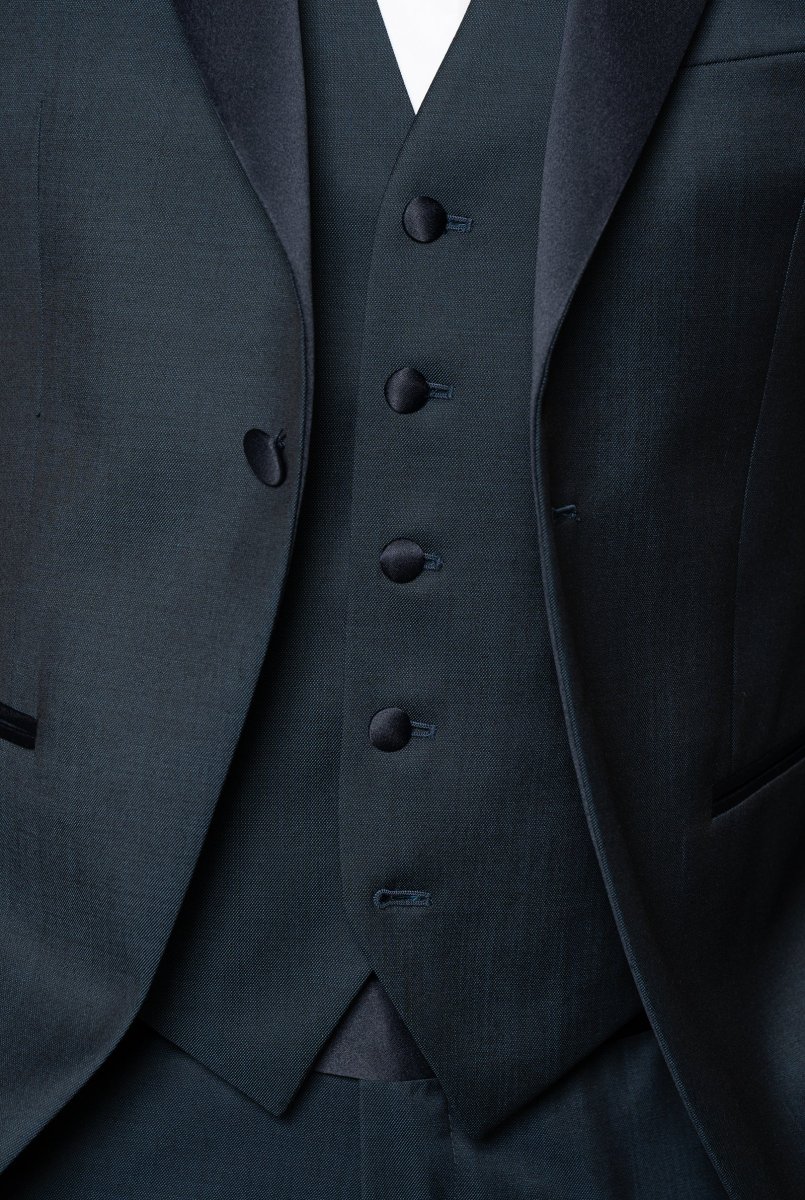 Smoking in tessuto lana super fine color blu ottanio, con rever a lancia in raso blu notte. Un bottone coperto in raso, tasche a filetto in raso e bottoni manica coordinati aggiungono un tocco di raffinatezza. Completa il design uno spacco centrale sul retro.