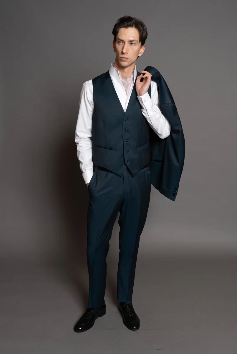 Smoking in tessuto lana super fine color blu ottanio, con rever a lancia in raso blu notte. Un bottone coperto in raso, tasche a filetto in raso e bottoni manica coordinati aggiungono un tocco di raffinatezza. Completa il design uno spacco centrale sul retro. Gilet monopetto in tessuto lana super fine color blu ottanio con […]