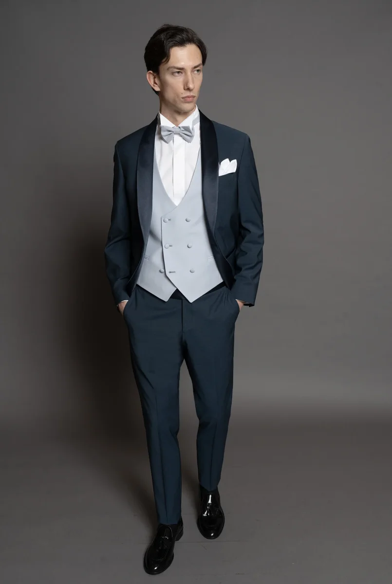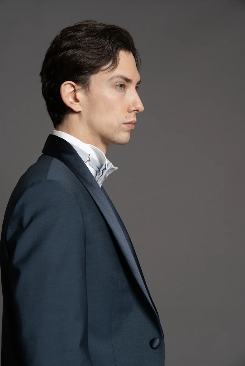 Smoking tessuto lana super fine e mohair color blu petrolio, rever a scialle in raso blu notte.