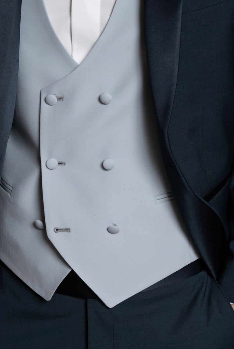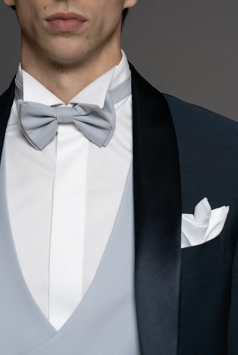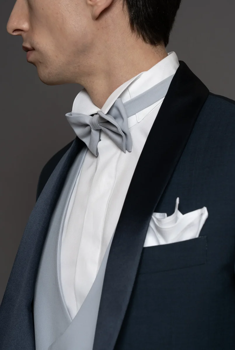 Smoking in tessuto lana super fine e mohair color blu petrolio, con rever a scialle in raso blu notte. Un bottone coperto in raso, tasche a filetto e bottoni manica coordinati aggiungono raffinatezza. Completa il design uno spacco centrale sul retro. Gilet doppiopetto in lana super fine color grigio gesso. Made in Italy. Guida alle […]