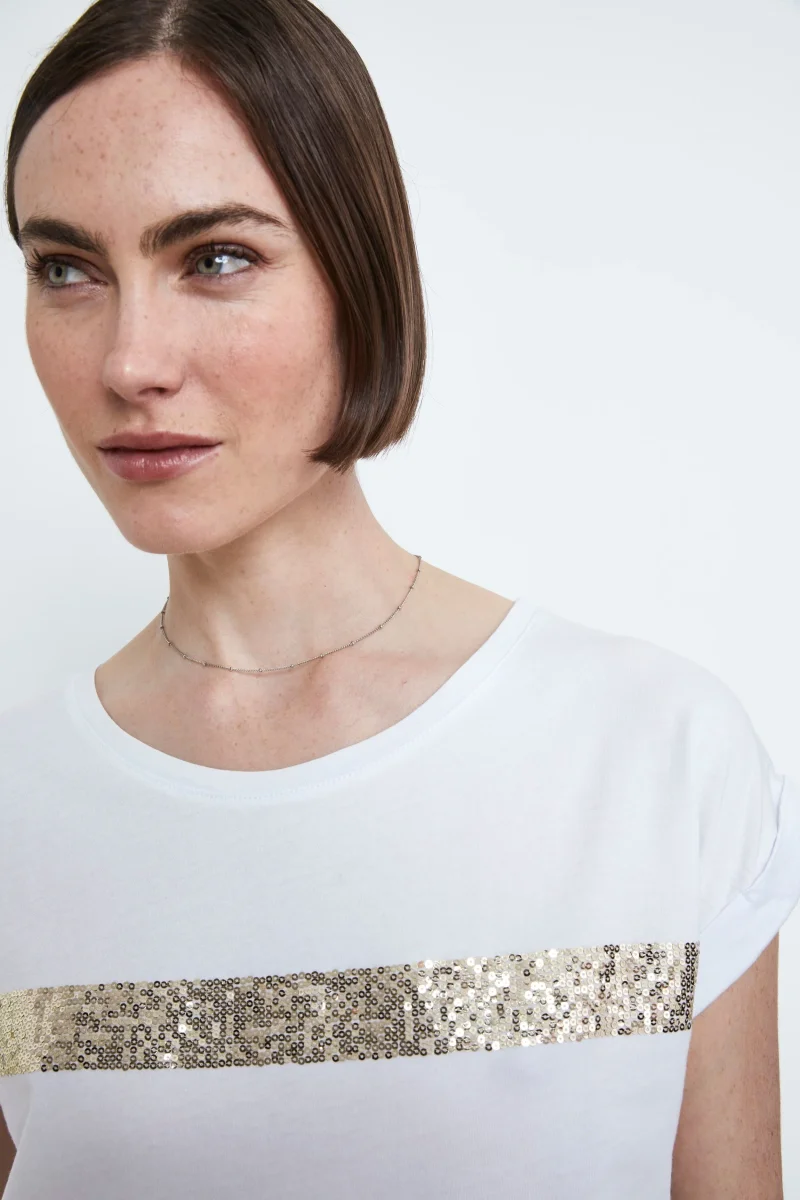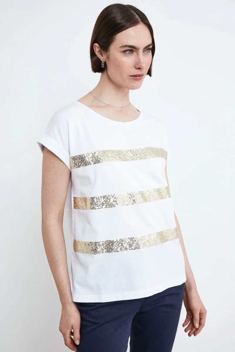 Maglietta mezze maniche 100% cotone con paillettes a righe orizzontali. Vestibilitร regolare. Indossa la nostra t-shirt con strass in cotone e lasciati avvolgere dalla sua eleganza e luminositร . Perfetta per un look casual chic o unโoccasione speciale, questa maglietta sarร la tua scelta ideale per brillare con stile. Completa lโoutfit con un pantalone o bermuda Il Lanificio. Made in Italy. La modella รจ alta 175 cm e indossa la taglia 40.