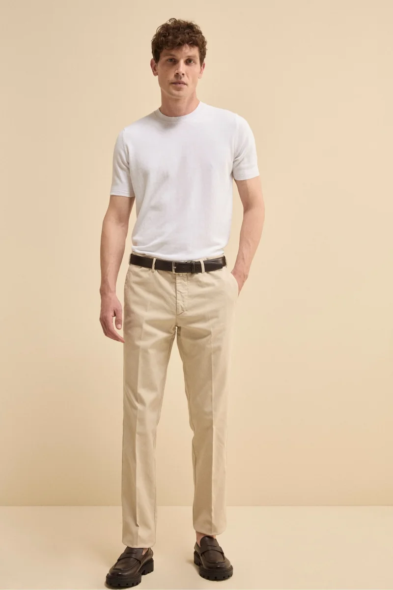 Questa t-shirt da uomo è realizzata in 100% cotone crêpe finezza 14, un filato leggero e traspirante che dona al capo una texture asciutta e sofisticata. Il design pulito è arricchito da bordi lavorati a coste e da una vestibilità regolare che garantisce comfort e versatilità. Parte della collezione IL Lanificio e interamente Made in Italy, è perfetta da abbinare a pantaloni chino, denim o sotto una giacca leggera per un look casual ma raffinato, ideale nelle giornate primaverili o estive. Il modello è alto 189 cm e indossa la taglia 50.