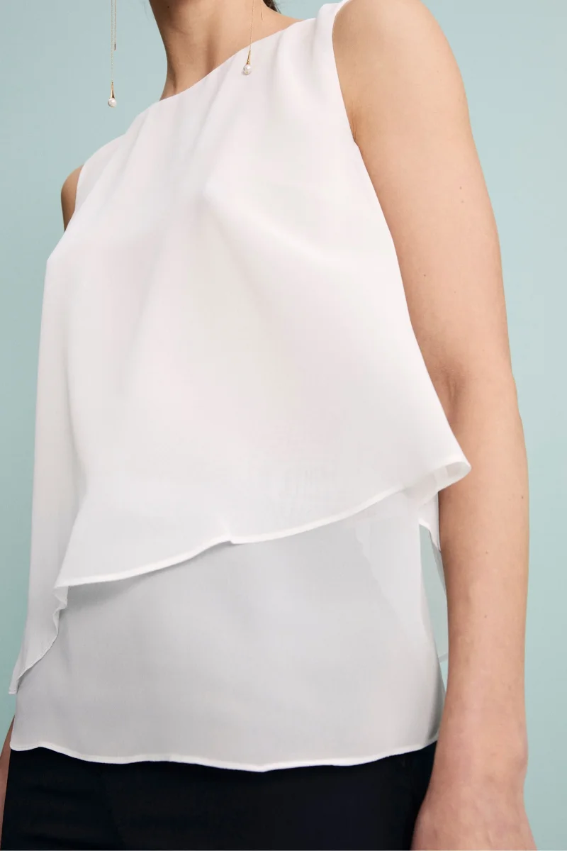 Top Elegante in Georgette con Pannelli, la scelta ideale per cerimonie ed eventi speciali. Realizzato in georgette leggera e fluida, รจ costruito a pannelli per un effetto moderno e dinamico. La vestibilitร morbida accarezza la silhouette con eleganza, mentre il design smanicato e la chiusura posteriore con bottone sul colletto completano il look con un tocco minimal e raffinato. Parte della collezione IL Lanificio e interamente Made in Italy, questo top elegante da donna รจ perfetto da abbinare a pantaloni palazzo o gonne midi per outfit contemporanei e ricercati. La modella รจ alta 177 cm e indossa la taglia 42.