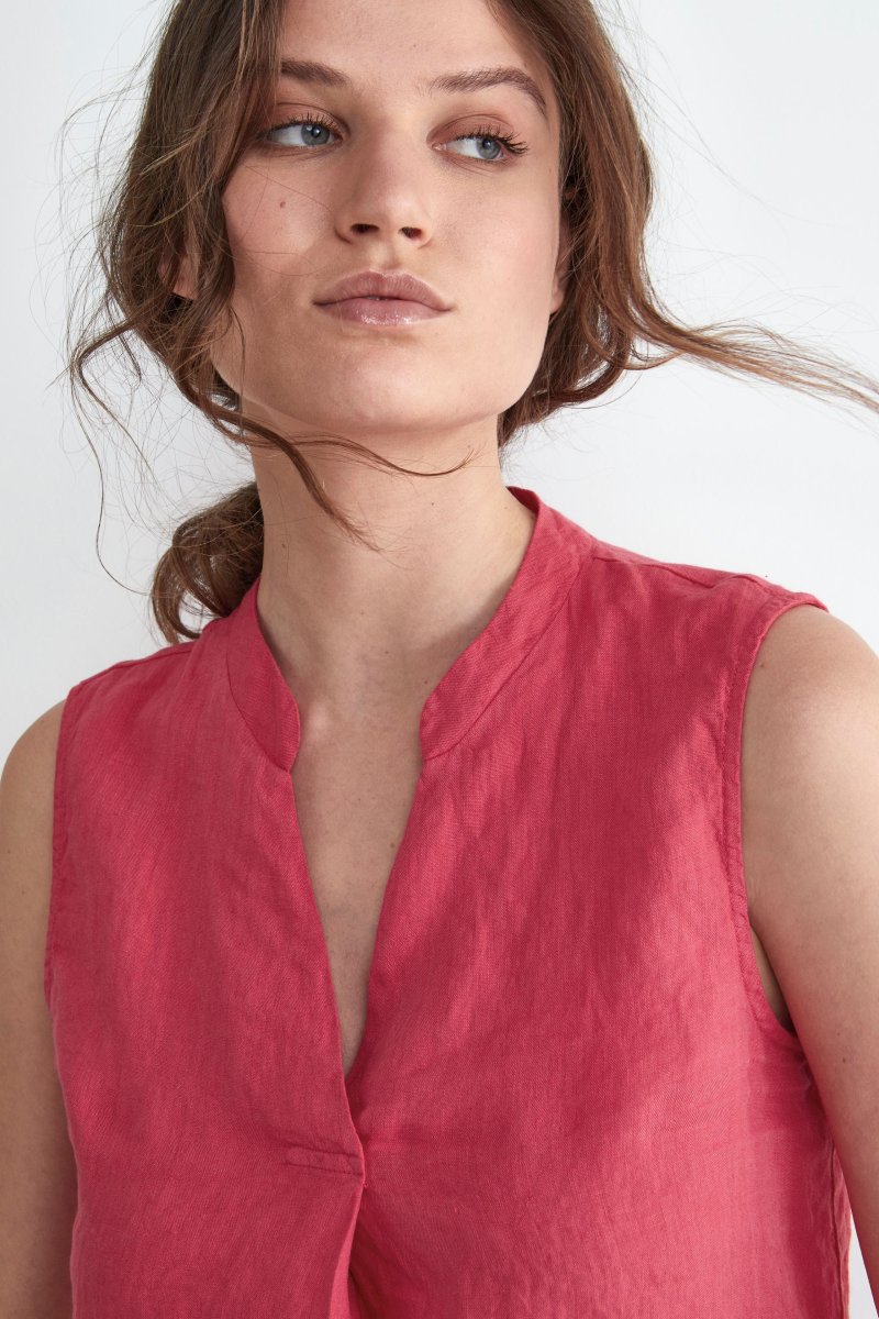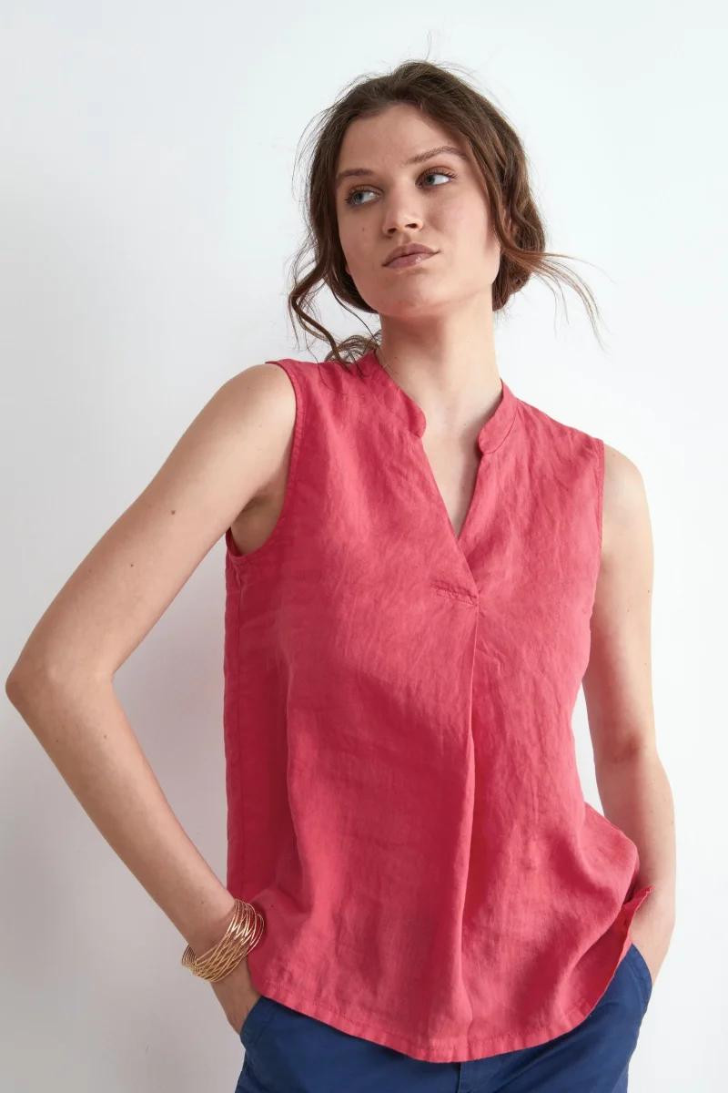 Top da donna in lino smanicato con scollo a V. Pratico e versatile si abbina perfettamente ai pantaloni e shorts in lino della collezione Il Lanificio. Vestibilitร regolare. La modella indossa la taglia 42. Made in Italy.