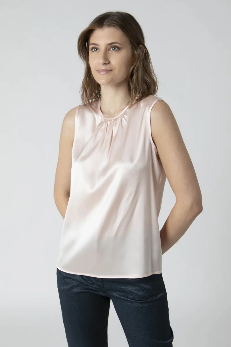 Top da donna smanicato realizzato seta monocolore. Vestibilitร morbida, modello girocollo con arricciature. Ideale come sottogiacca รจ la scelta ideale per chi cerca un capo elegante e sofisticato. La modella รจ alta 174 cm e indossa la taglia 40. Made in Italy.