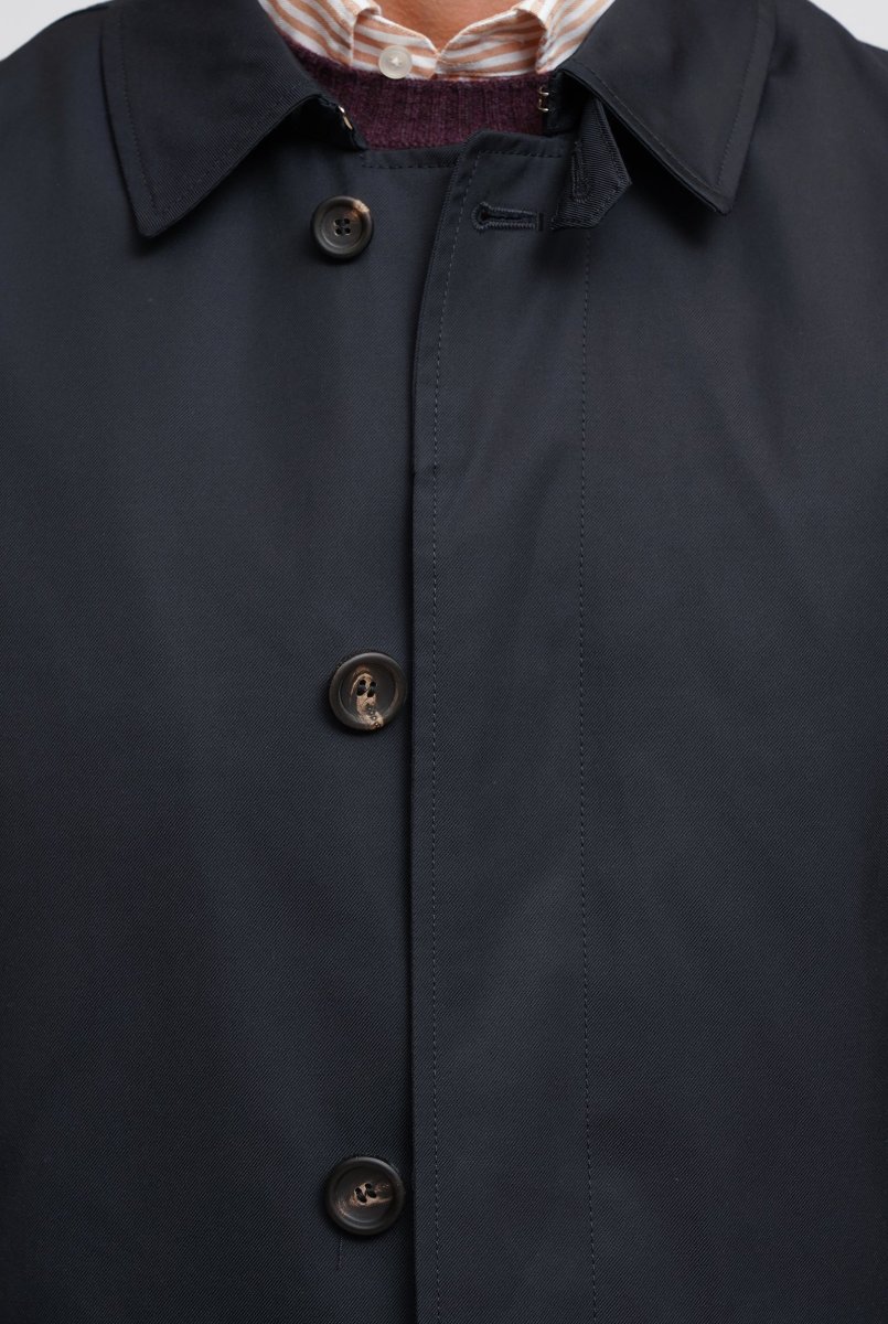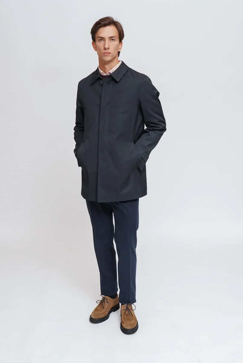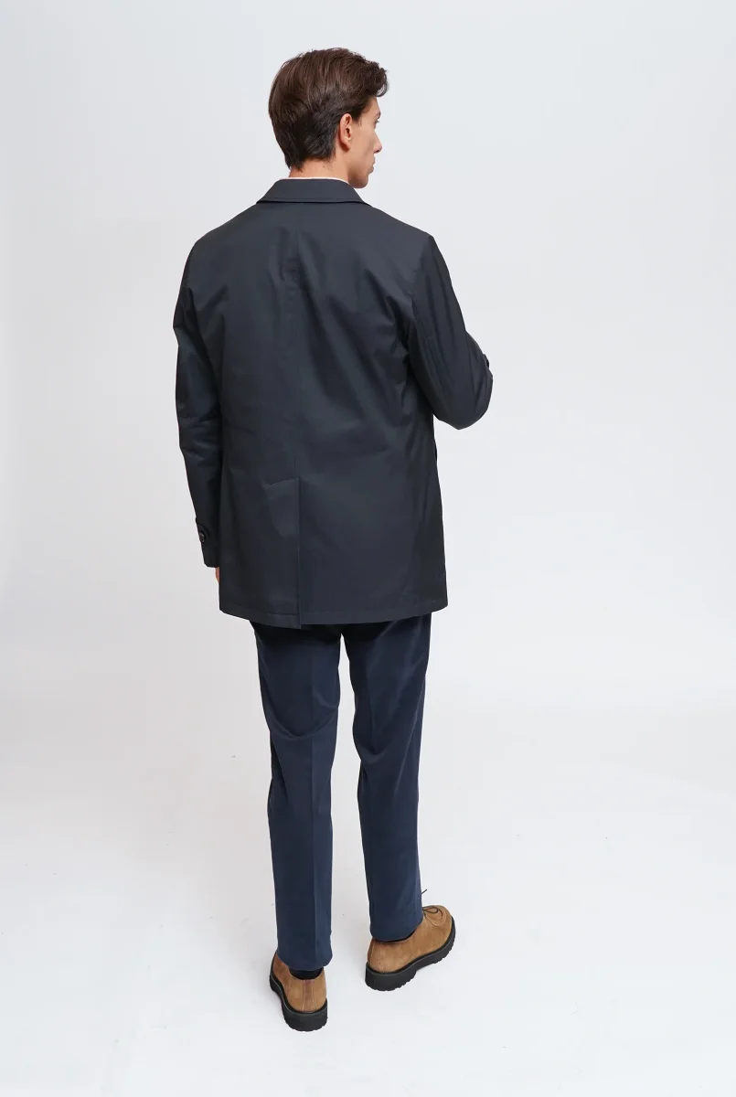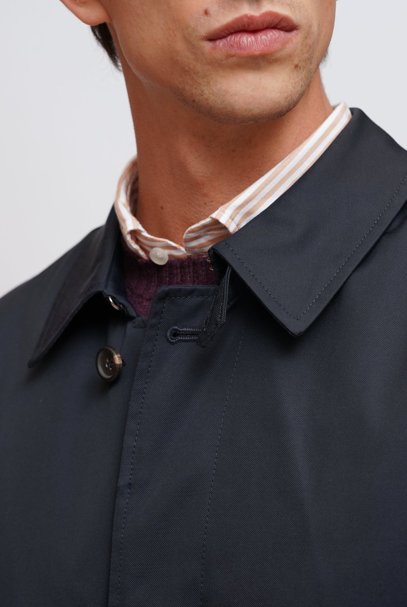 Trench confeionato con un tessuto tecnico Olmetex completamente sfoderabile color blu.