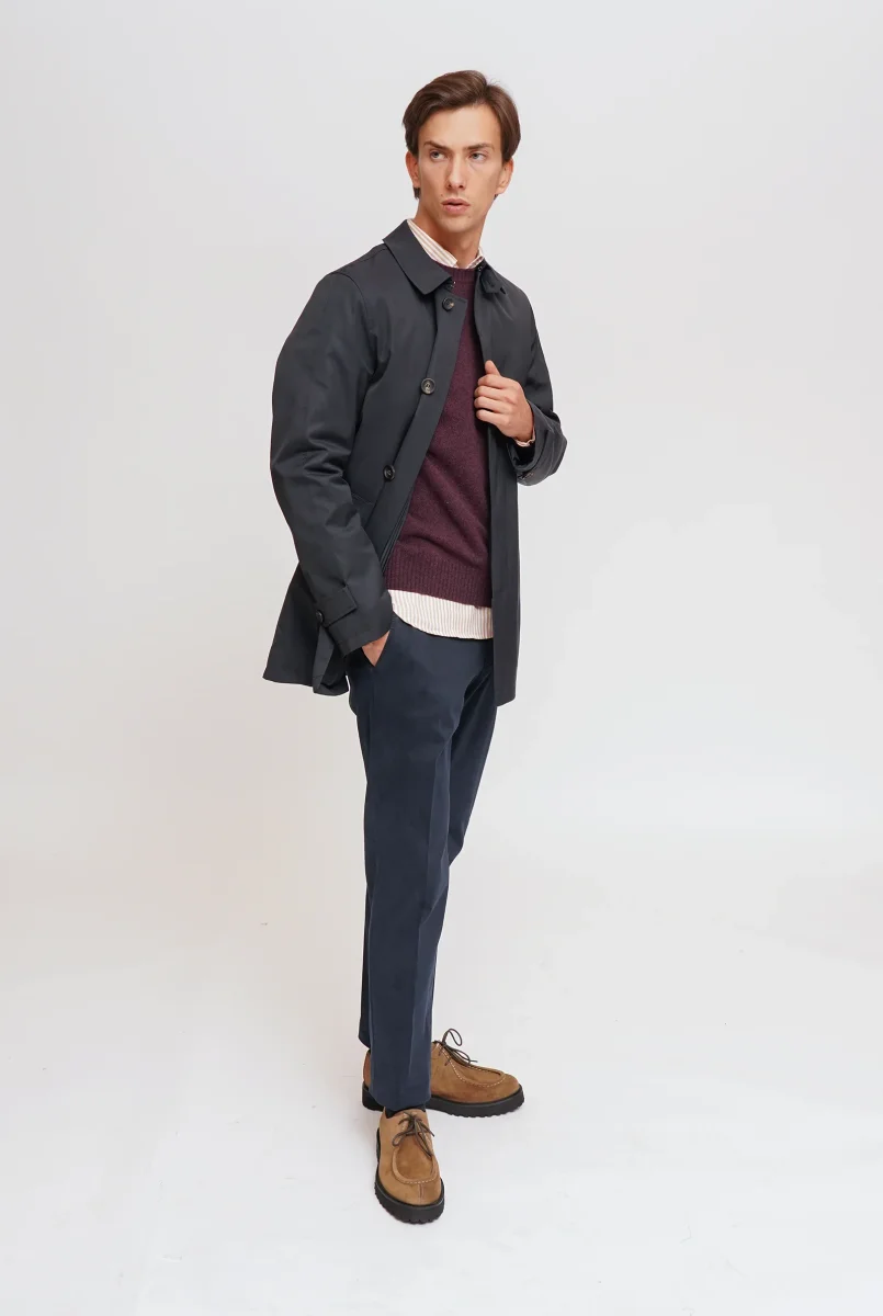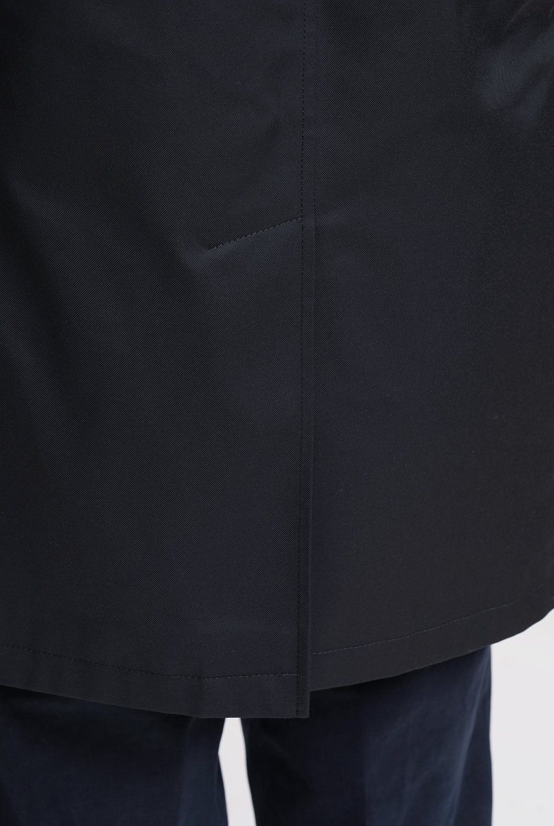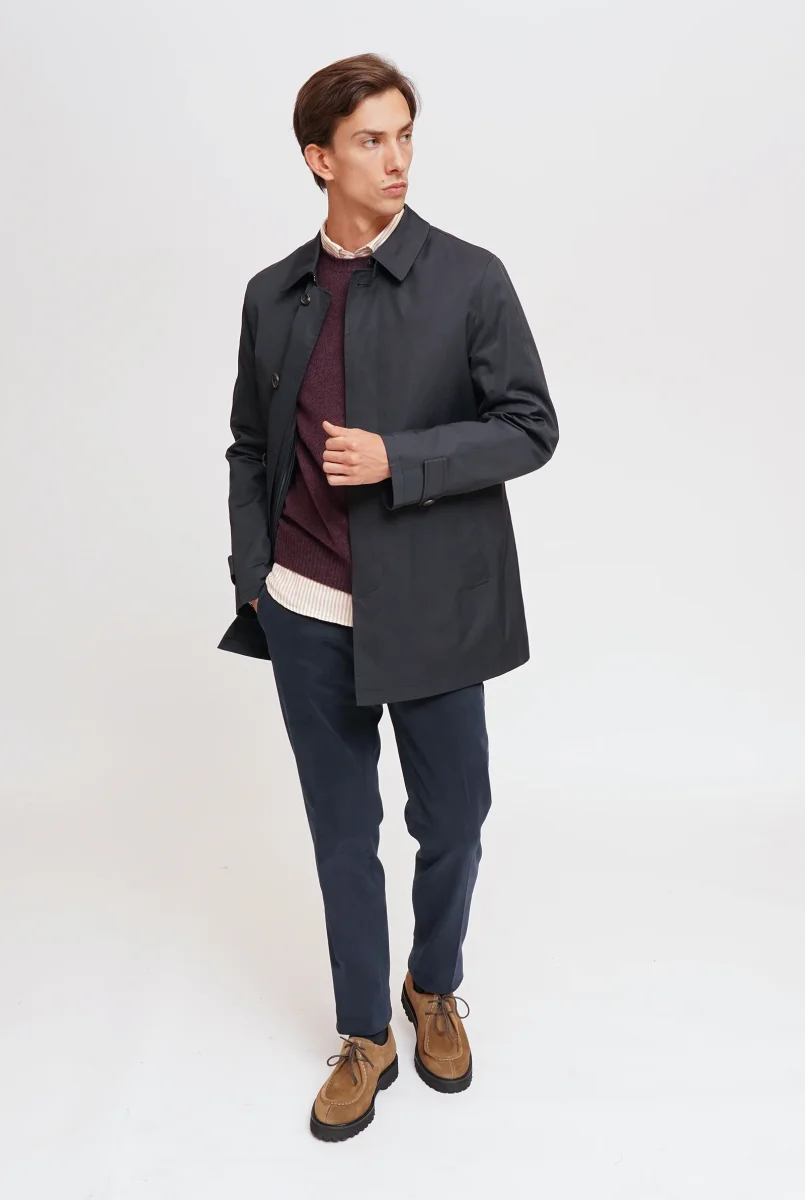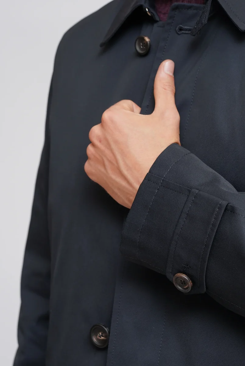 Trench confeionato con un tessuto tecnico Olmetex completamente sfoderabile color blu.