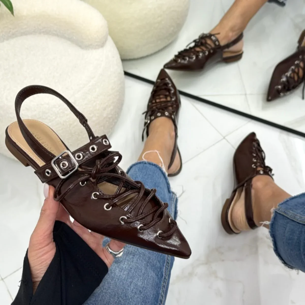 COLORI: MARRONE – BEIGE – NERO Ballerina slingback da donna dal carattere deciso e contemporaneo. Il modello presenta una punta affusolata e una lacciatura frontale che dona un tocco grintoso e originale. Il cinturino posteriore regolabile garantisce una calzata stabile e confortevole, mentre i dettagli metallici valorizzano il design rendendolo unico e di tendenza. La […]