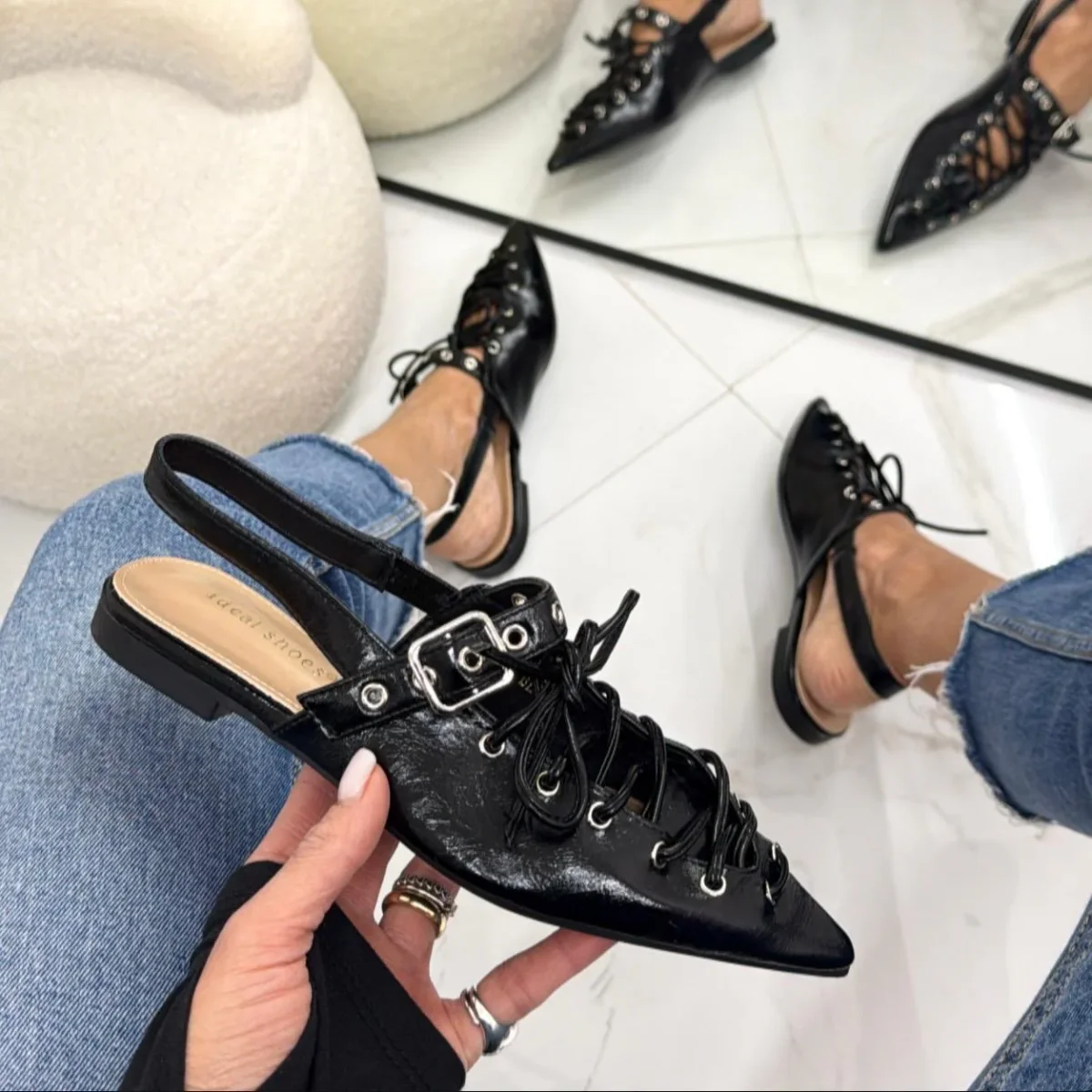 Ballerina slingback da donna dal carattere deciso e contemporaneo. Il modello presenta una punta affusolata e una lacciatura frontale che dona un tocco grintoso e originale. Il cinturino posteriore regolabile garantisce una calzata stabile e confortevole, mentre i dettagli metallici valorizzano il design rendendolo unico e di tendenza. La suola bassa assicura comfort durante tutta la giornata, rendendo questa calzatura ideale sia per look casual che per outfit piรน ricercati. Un modello versatile, perfetto per chi ama distinguersi con stile.