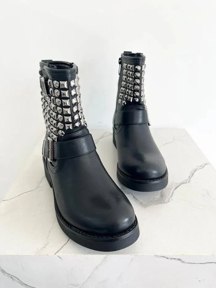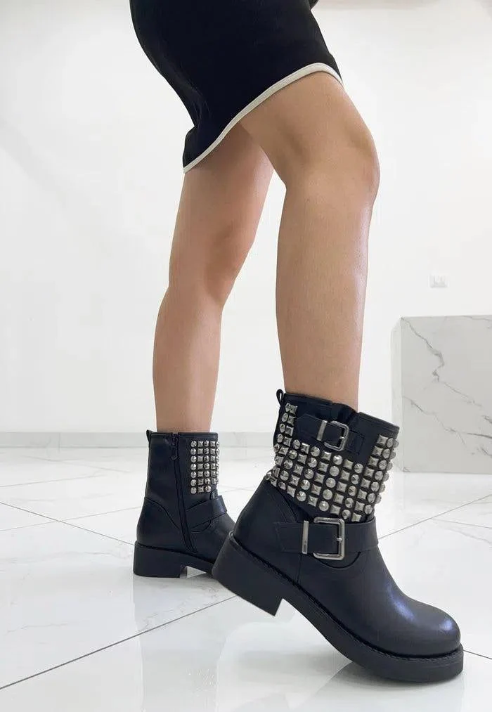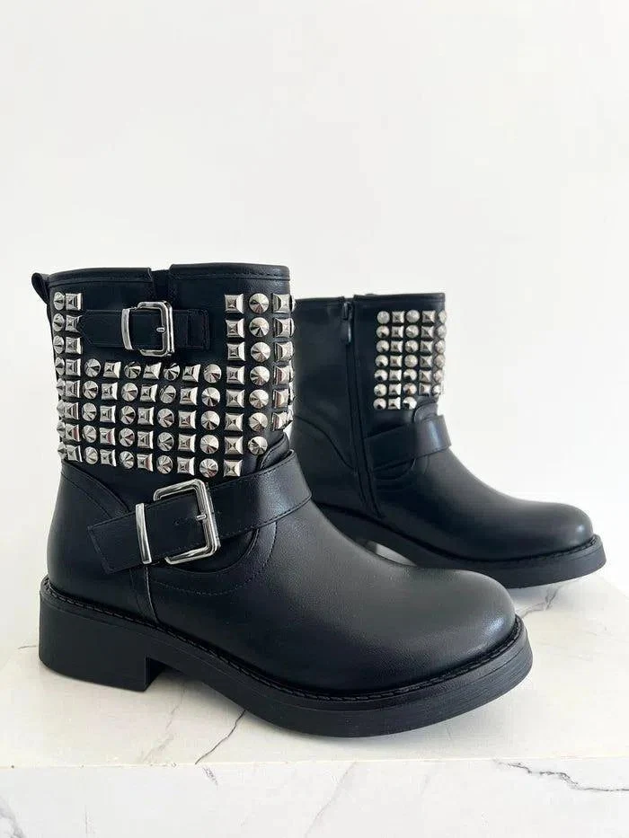 “TUNDA รจ una platform adornata con fibbie e borchie, realizzata in ecopelle. Presenta un tacco di 5 cm che offre un’eleganza sobria e un comfort insuperabile. La circonferenza della caviglia รจ di 28 cm e l’altezza dello stivale รจ 18.5 cm, garantendo una calzata regolare perfetta. “TUNDA” rappresenta la scelta ideale per chi cerca una scarpa che unisce stile e comfort.