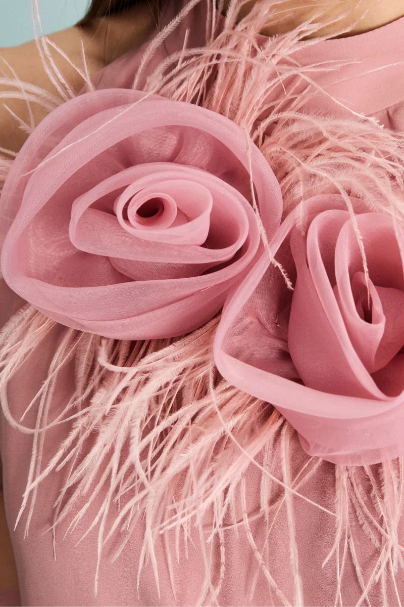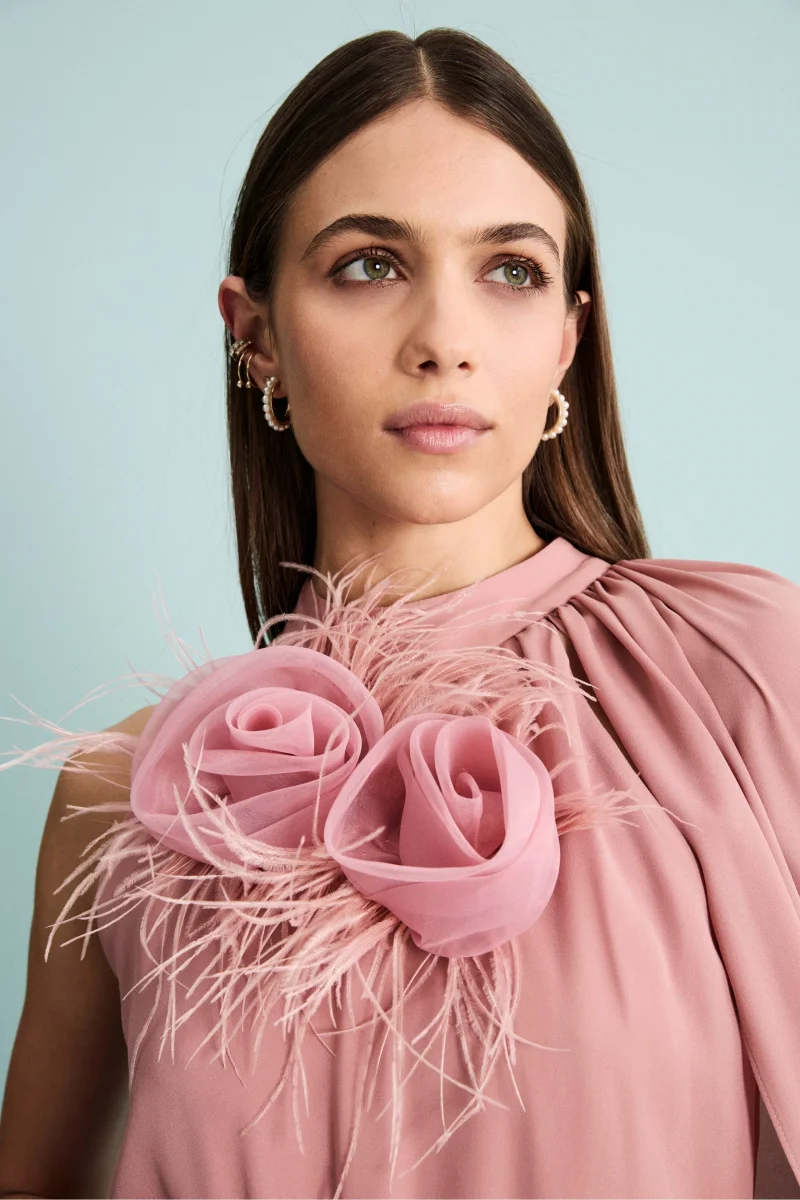 Tuta da cerimonia in georgette plissettata da donna, leggera e fluida, pensata per seguire le linee del corpo con eleganza. Il modello รจ smanicato, con scollo girocollo e pantaloni a gamba larga, che offrono comfort e movimento senza rinunciare allo stile. Sul petto, una decorazione di piume di struzzo e petali in organza dona un […]