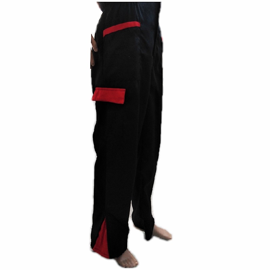 Apertura fondo gambe con cerniera, mostrina in contrasto rosso