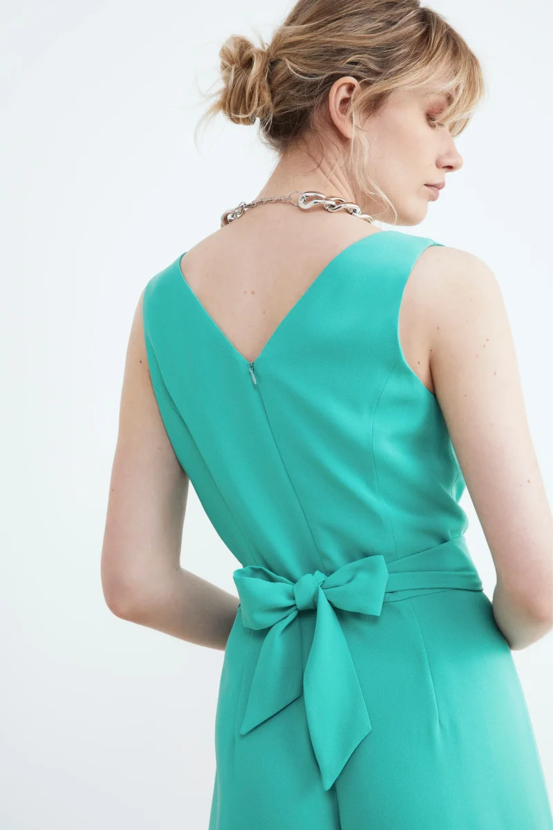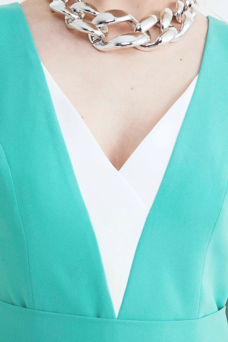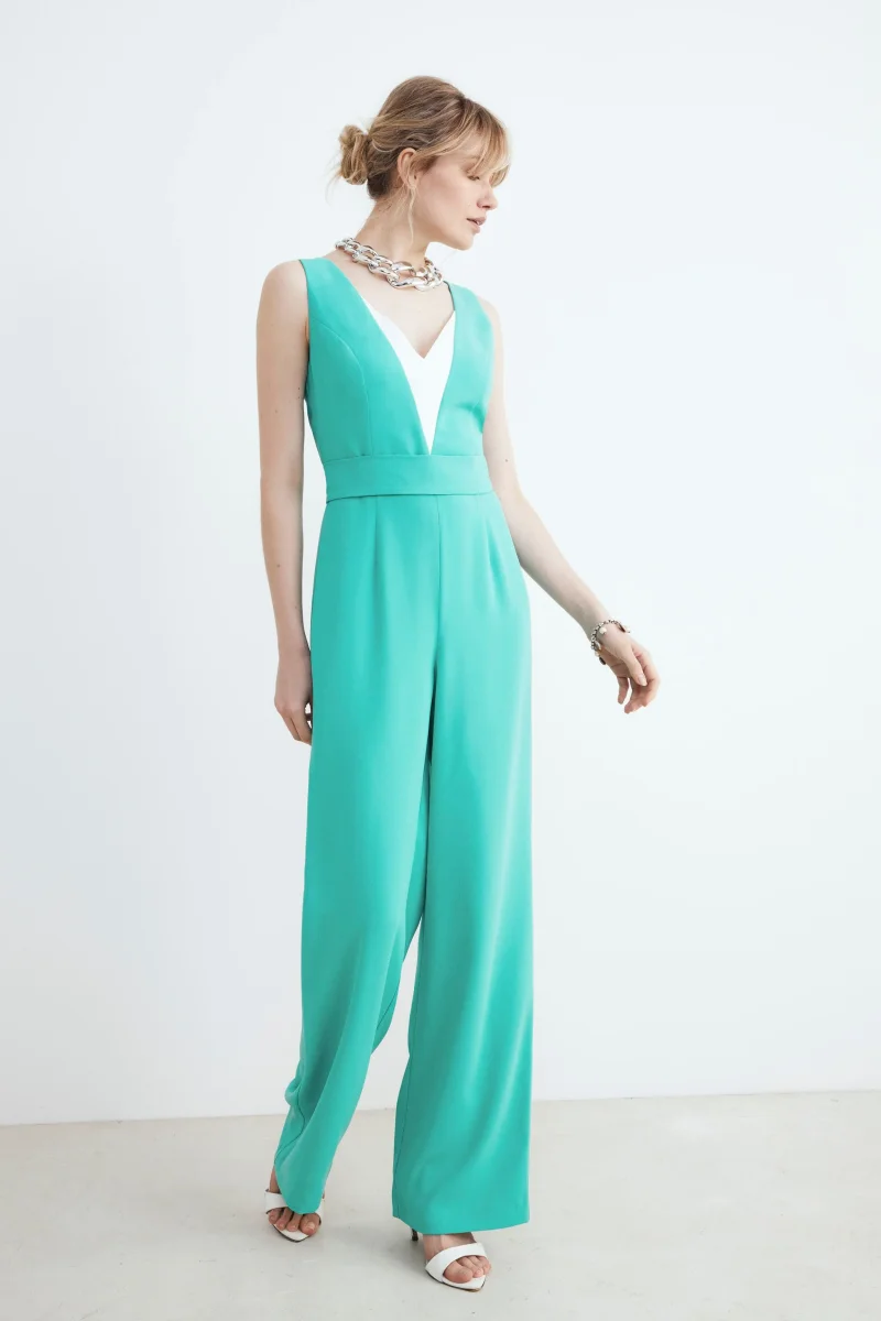Tuta da donna bicolore con fusciacca e chiusura a zip. Capo di estrema eleganza, classe e comoditร ideale per qualsiasi tipo di cerimonia. Vestibilitร regolare e Made in Italy. La modella รจ alta 175 cm e indossa la taglia 42.