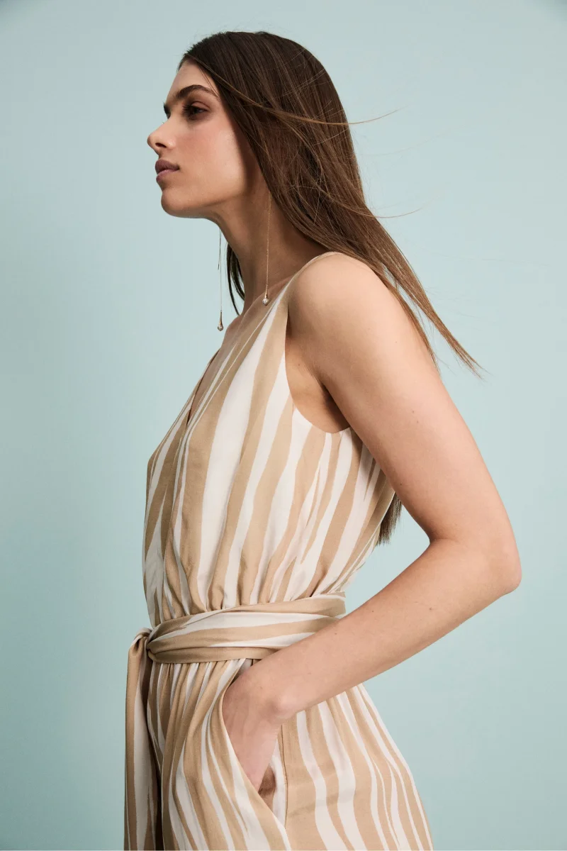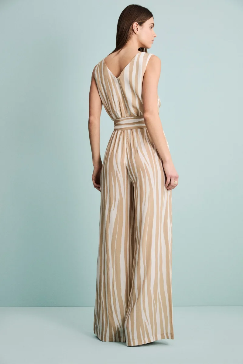 Tuta Elegante in Fantasia con Fusciacca, un capo esclusivo da donna, perfetto per cerimonie ed eventi speciali. Realizzata in 100% morbida viscosa, questa tuta offre un comfort eccezionale e una sensazione di lusso sulla pelle. Lo scollo a V e la fusciacca in vita mettono in risalto la silhouette, mentre la vestibilitร fluida garantisce libertร di movimento e uno stile contemporaneo. Il pantalone a gamba larga aggiunge un tocco di modernitร , mentre le tasche nascoste laterali offrono praticitร senza compromettere il look. Completamente Made in Italy, questa tuta da donna fa parte della collezione IL Lanificio, sinonimo di qualitร e stile senza tempo. La modella รจ alta 177 cm e indossa la taglia 42.