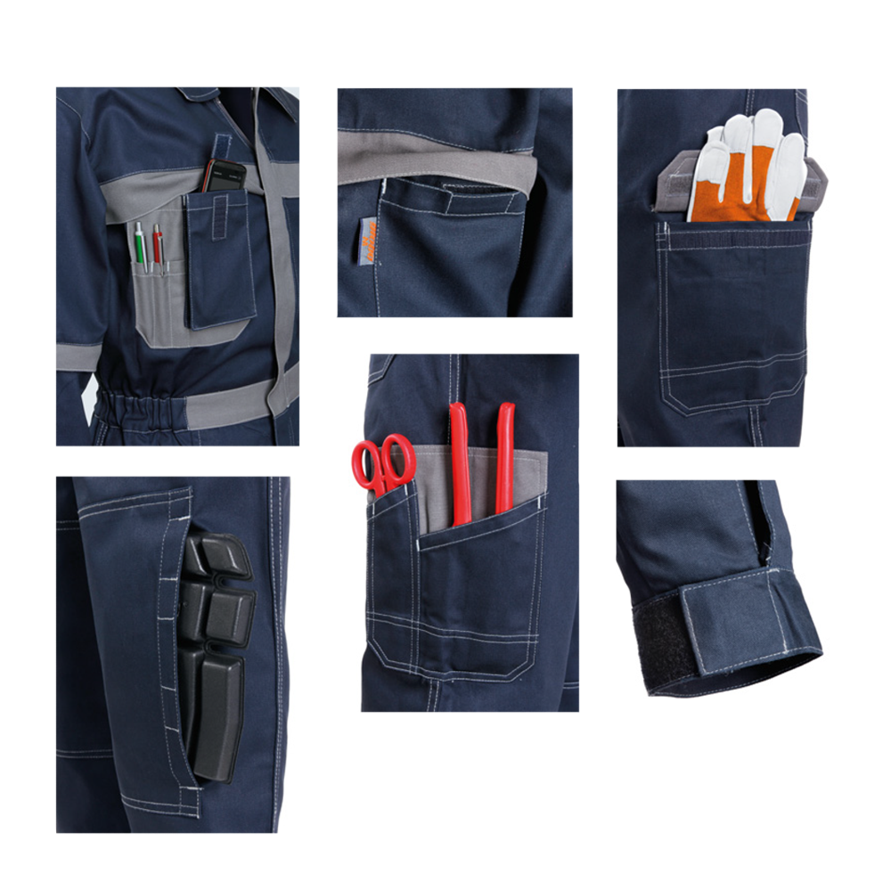 Tuta da lavoro multitasche bicolore Mezze maniche staccabili con cerniera Vestibilitร Slim Fit Velcro ai polsi Tessuto 100% cotone sanforizzato con inserti in poliestere cotone