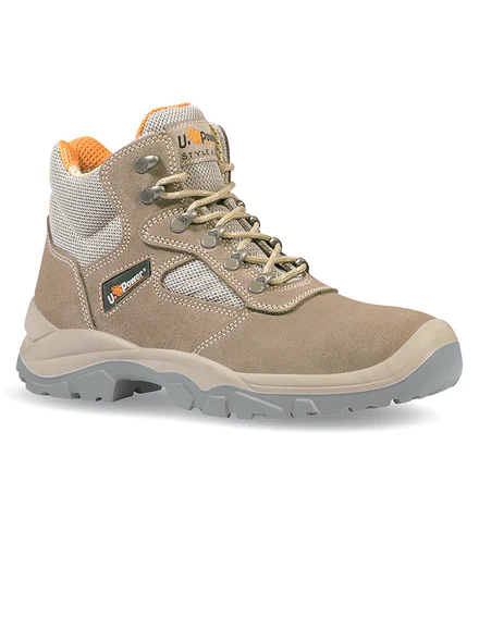 Scarpe antinfortunistiche alte, classiche e robuste u power della linea Style&Job, con tomaia in pelle scamosciata con inserti Textile ultra traspirante, puntale in acciaio, antiperforazione, antiscivolo, lamina in acciaio ergonomica e suola PU/PU, S1P SRC