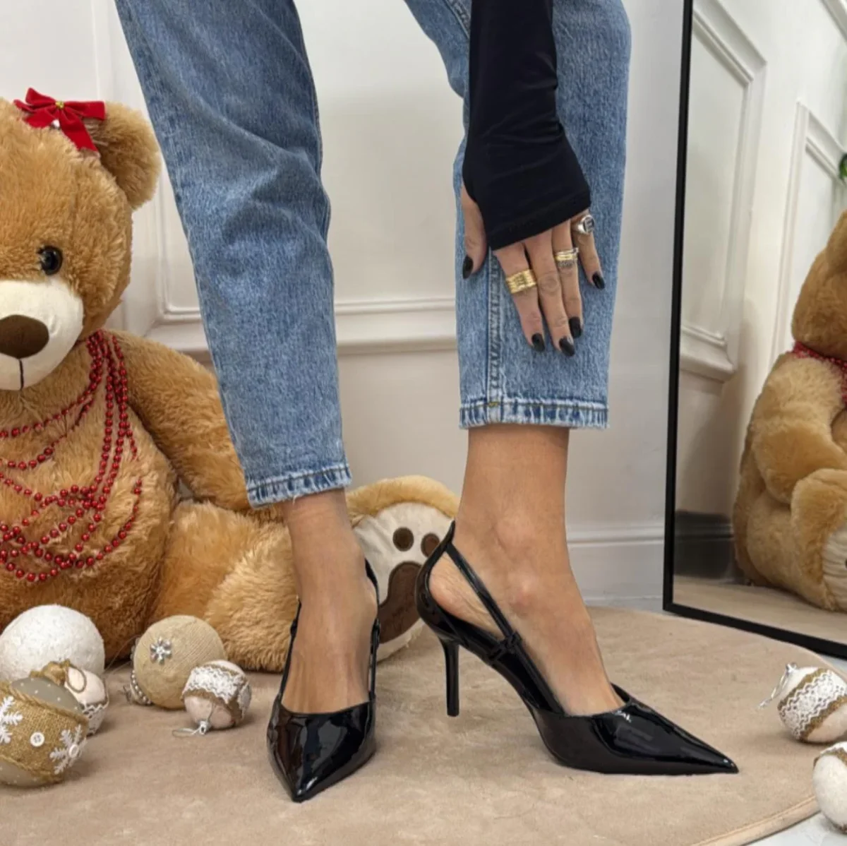 COLORI: NERO – MARRONE – BORDEAUX Un classico intramontabile rivisitato con un tocco moderno. Queste décolleté in eco pelle verniciata lucida slanciano la figura grazie alla punta affusolata e al tacco a spillo alto 8cm, mentre il sottile cinturino regolabile alla caviglia aggiunge femminilità e stabilità. Perfette per un look raffinato da sera o per […]